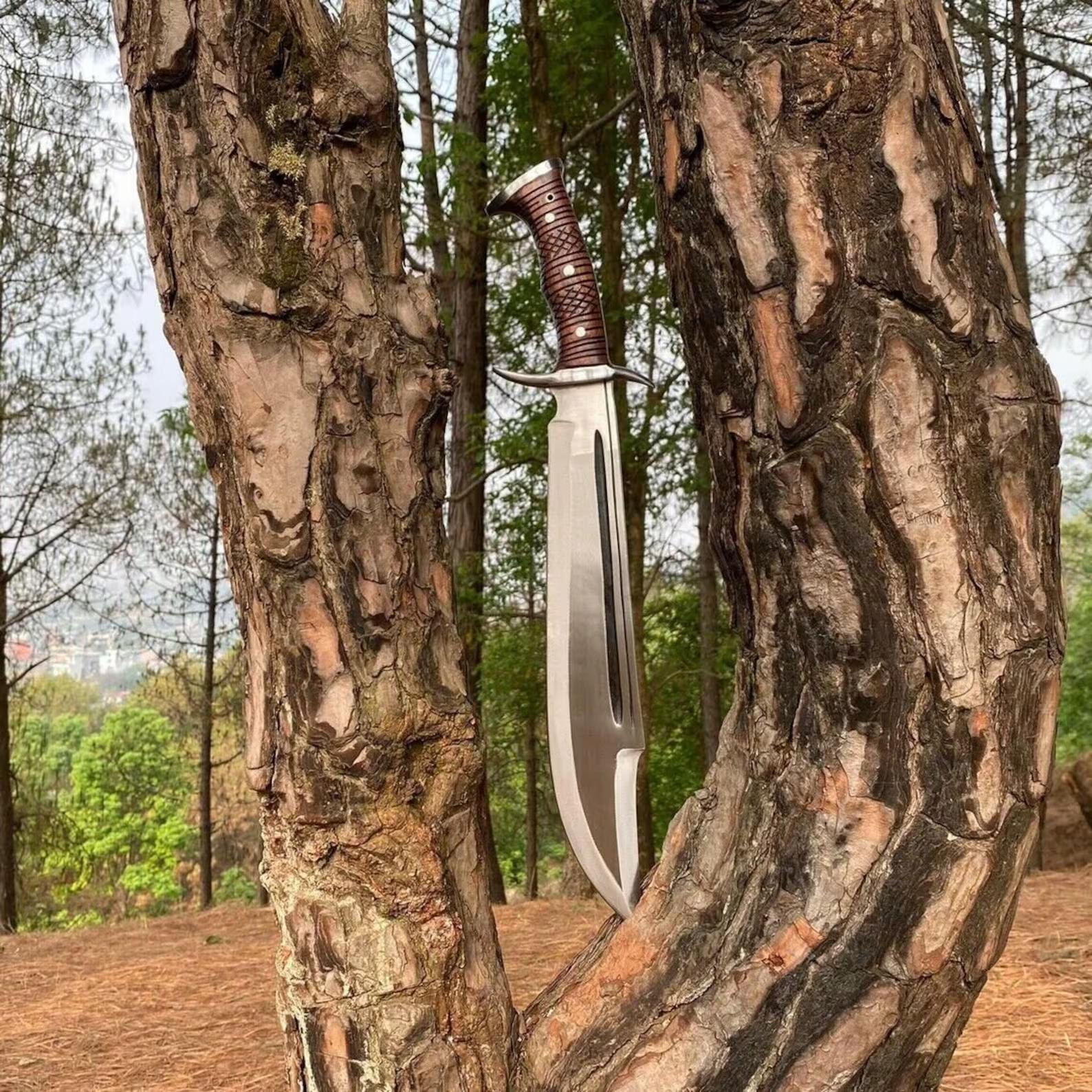 This Handmade D2 Steel Bowie Knife is crafted for hunters, campers, and survivalists who demand strength, reliability, and elegance in their gear. Measuring 14 inches overall with a 9-inch blade, this knife is forged from premium D2 tool steel, a high-carbon, high-chromium steel known for its outstanding hardness, toughness, and resistance to wear. With a Rockwell hardness rating of 57–60 HRC, the blade is razor-sharp and holds its edge even under heavy use, making it perfect for cutting, skinning, chopping, or outdoor survival tasks.The handle is made from natural rosewood, offering a comfortable and secure grip with a warm, classic aesthetic. Complemented by a D2 steel guard and fittings, the design ensures both functionality and durability. The knife includes a custom handmade cowhide leather sheath, designed for safe carrying and long-lasting protection.