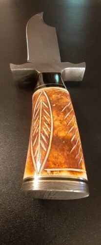 Experience the perfect combination of craftsmanship and durability with this handmade D2 steel Bowie knife, featuring a striking camel bone handle. Measuring 16 inches overall with a 10.5-inch razor-sharp blade, this knife is forged from premium D2 tool steel, renowned for its high carbon and chromium content. The blade is heat-treated and air-hardened to a Rockwell hardness of 58–60 HRC, ensuring exceptional edge retention, toughness, and reliability for hunting, camping, and outdoor survival.Designed with a full tang construction, this Bowie knife delivers maximum strength, balance, and control during demanding tasks such as skinning, chopping, or preparing campfire wood. The ergonomic camel bone handle offers a comfortable and secure grip, combining elegance and functionality in one stunning package. Reinforced with steel fittings, it provides superior durability and safety for extended use.