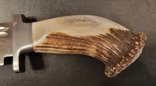 Elevate your knife collection with this stunning handmade Bowie knife, crafted from premium D2 tool steel and featuring a genuine stag crown handle. Known for its exceptional hardness and superior edge retention, the D2 steel blade ensures reliable performance for hunting, camping, survival, and outdoor tasks.The rugged stag crown handle adds a natural, rustic touch while offering a secure and comfortable grip, making it as functional as it is beautiful. With its full tang construction, this Bowie knife is built for durability, strength, and balance, ready to withstand demanding use in the field.Each knife is a true work of art, showcasing handcrafted detail that makes it one of a kind. Complete with a hand-stitched leather sheath for safe storage and easy carry, this knife is both a reliable tool and a collector’s piece.