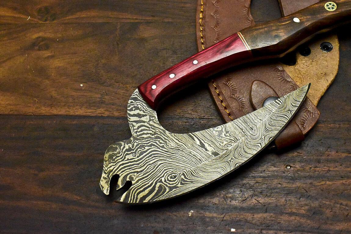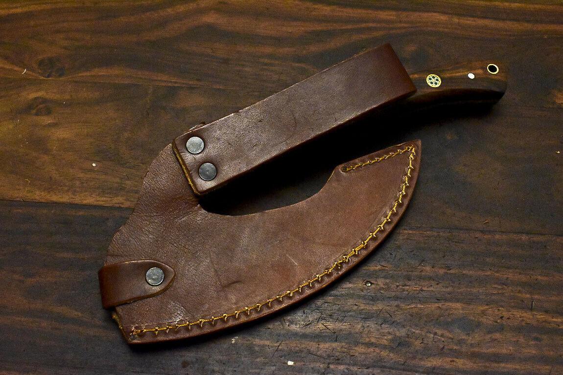This hand made Damascus axe is a true collector’s masterpiece, blending traditional craftsmanship with modern performance. Featuring a prestigious Damascus steel axe blade folded 5 times from 9 layers of 1095 and 15N20 steel, it achieves approximately 288 layers, offering exceptional strength, durability, and edge retention with a 60 Rockwell hardness. The 5 mm thick blade showcases expert hand grinds on both sides with a false edge on top, providing superior cutting performance. With an overall length of 14.3 inches, a cutting edge of 6.3 inches, and a width of 3.3 inches, this handmade Damascus axe is perfect for hunting, chopping, or display. The handle is made of rich walnut wood with a Damascus steel bolster, combining elegance and ergonomic comfort. Each piece comes with a custom sheath and is backed by a lifetime warranty, ensuring reliability and long-lasting use. Whether used as a Damascus battle axe, Damascus camp axe, or a collector’s display piece, this knife represents a superlative work of art. Its unique folding pattern and flawless craftsmanship make it a standout item for enthusiasts of Damascus axes, Viking-style tools, or high-quality handmade outdoor knives. This Damascus steel axe for sale is a rare, one-of-a-kind treasure