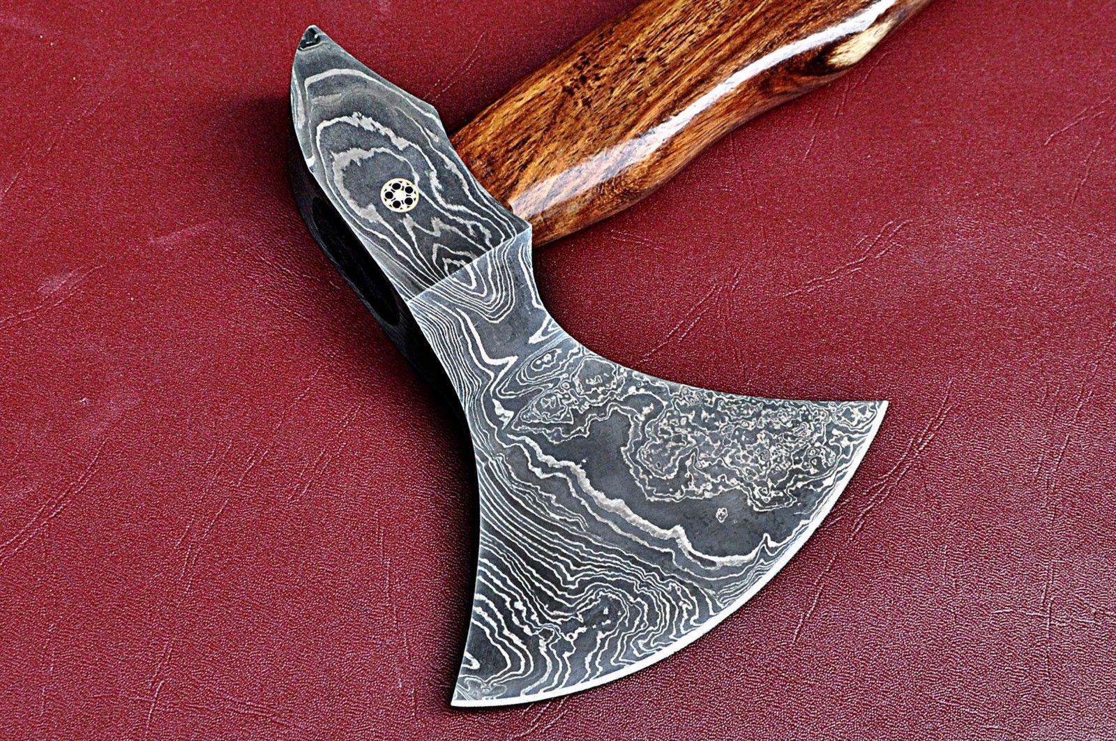 This handmade Damascus axe with wood handle is a premium piece of craftsmanship designed for both function and aesthetics. Forged from high-quality Damascus steel, the blade is created by welding and hammering layers of high carbon and low carbon steel multiple times to achieve up to 200 layers, forming a beautiful twist pattern. Each axe is unique and represents the strength and elegance of traditional forging techniques.