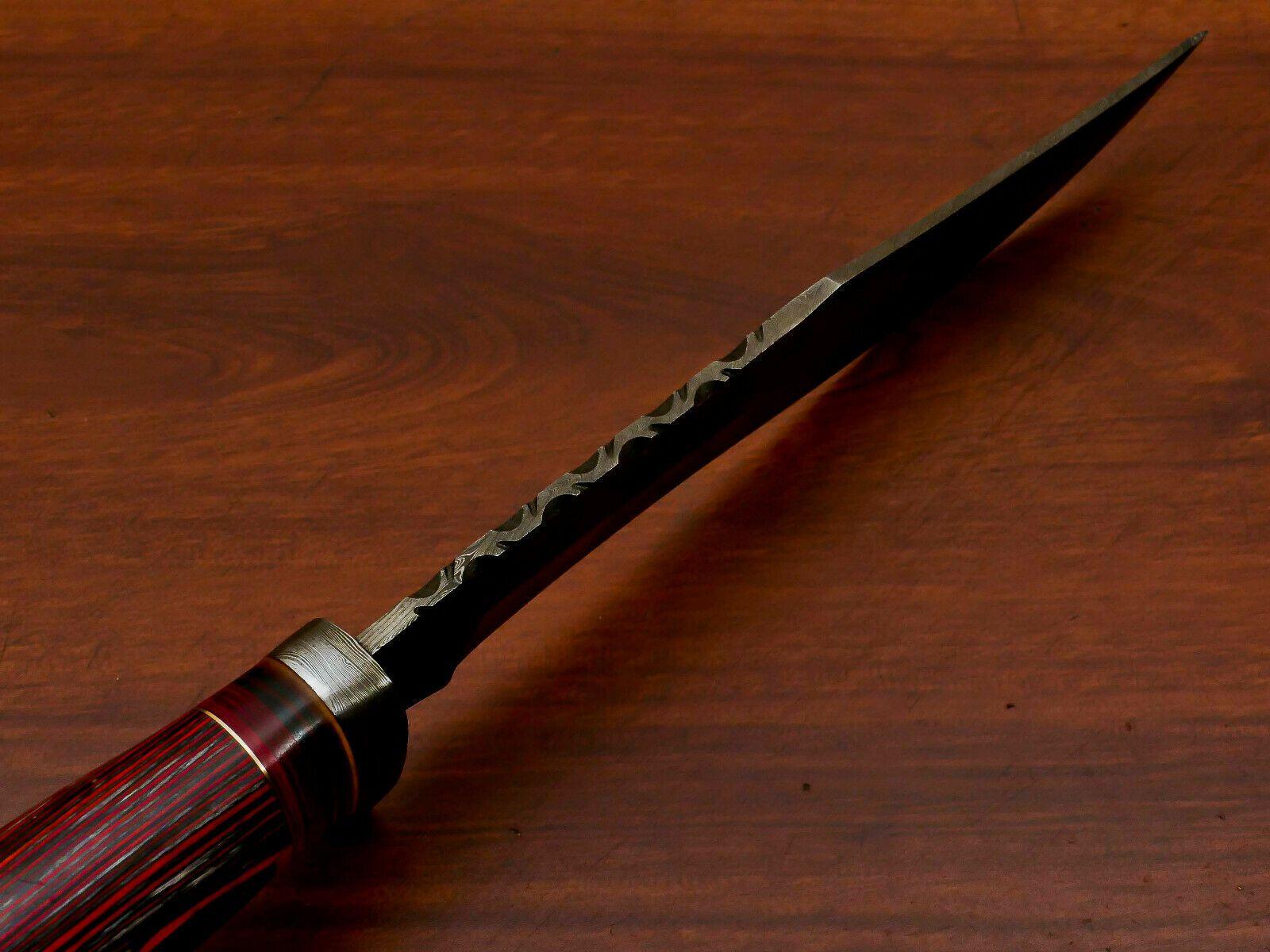 Experience unmatched craftsmanship with this Handmade Damascus Custom Bowie Hunting Knife, meticulously forged by artisan Rody Stan. Featuring a robust 4mm thick Damascus steel blade crafted from 512 true layers of 1095 and 15N20 high carbon steel, this knife offers exceptional cutting performance and durability. The blade’s unique saw-blade effect at a microscopic level keeps it sharp far longer than typical blades.