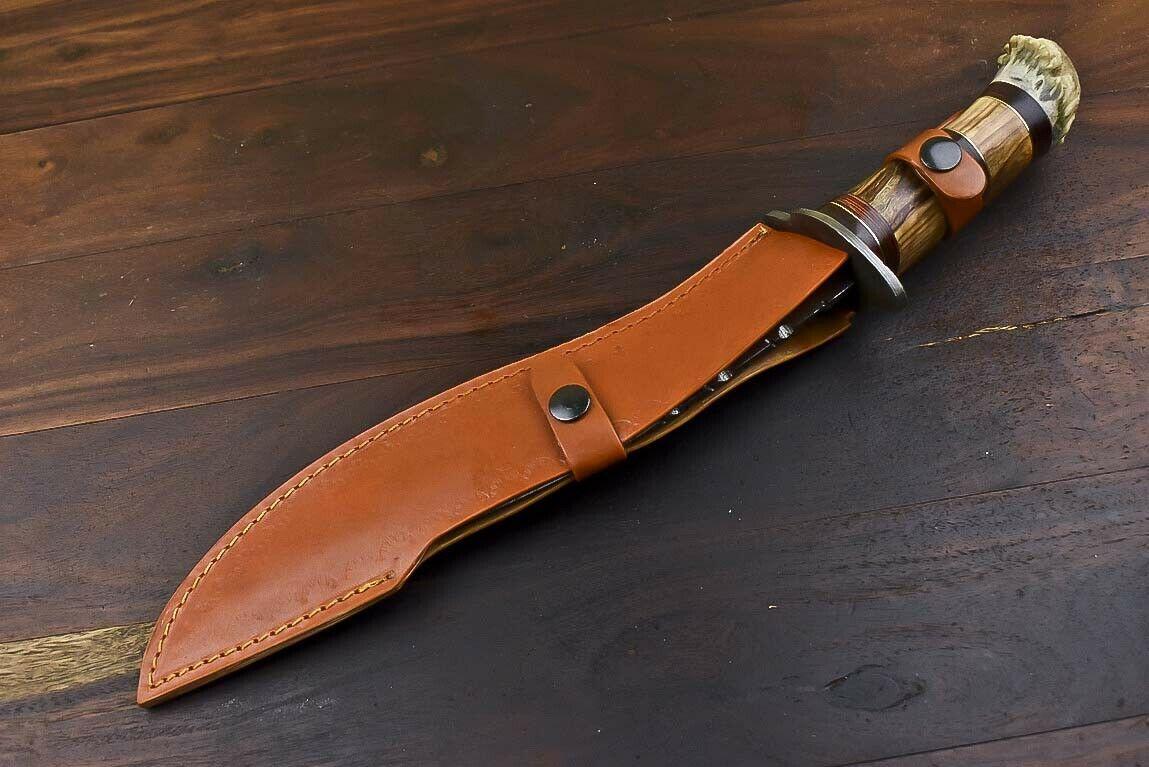 The handle is crafted from authentic crown antler, giving each knife a unique character, natural grip, and rugged beauty. Balanced with a solid guard, the design ensures safety, stability, and strength during demanding use. Whether carried for hunting, camping, or survival, this custom Bowie knife combines functionality with artistry, making it a versatile tool and a prized collectible.