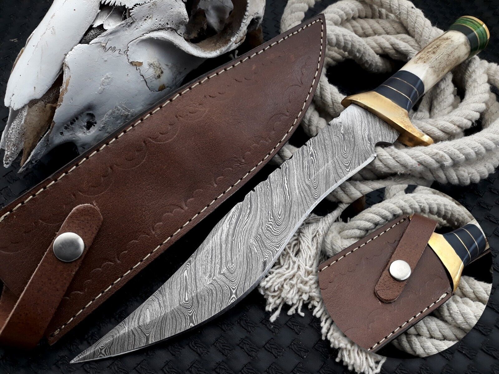 Each knife is one of a kind, made in Pakistan by expert bladesmiths using premium materials. Handle shape and coloration may vary slightly, reflecting the uniqueness of each handmade piece. This Damascus steel camp knife is perfect for hunting, camping, or collecting and promises lasting performance with proper care.