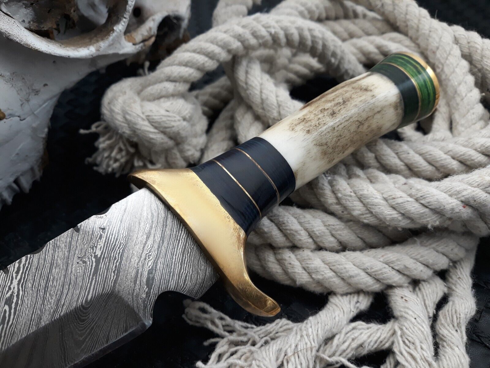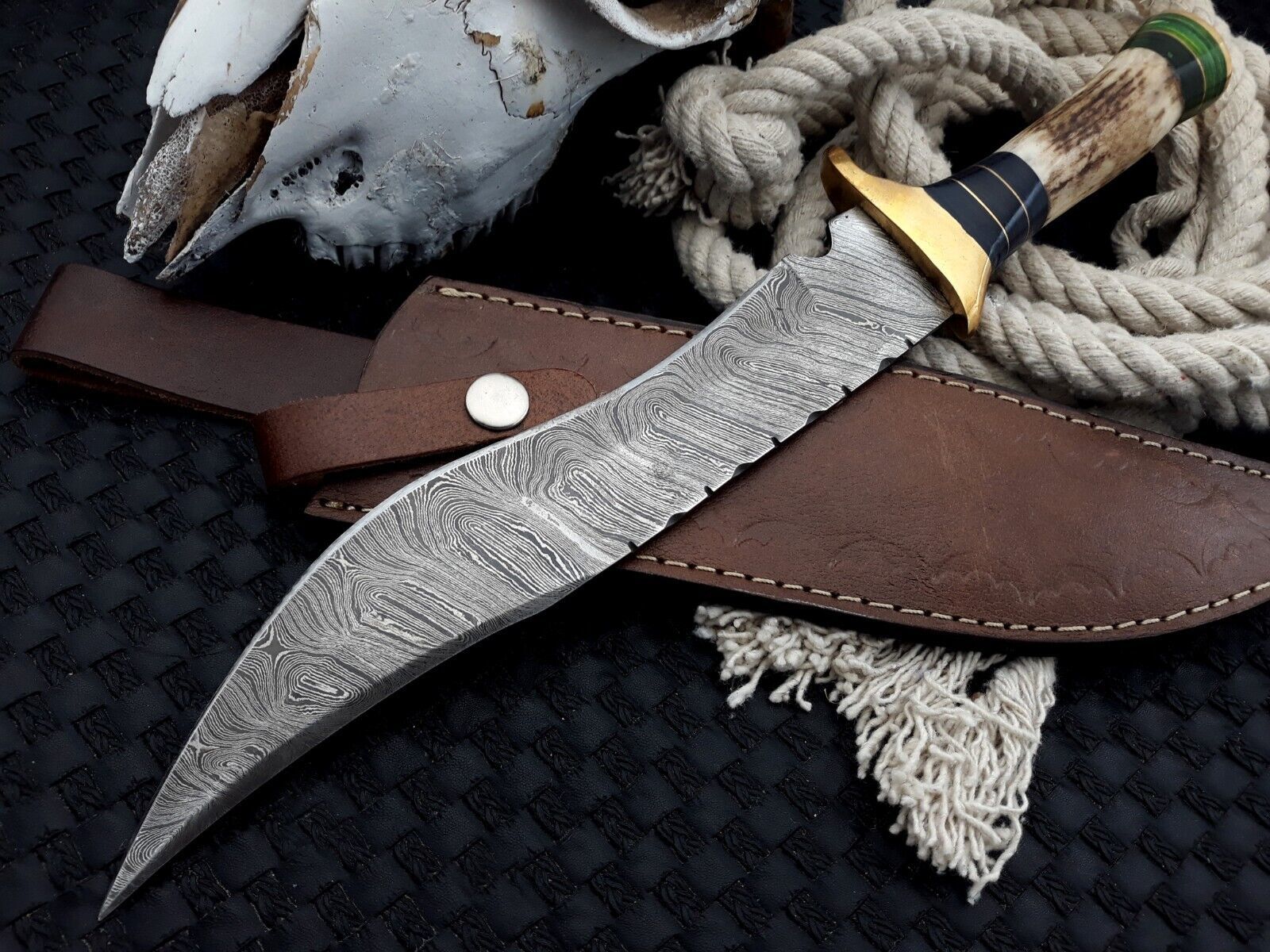 Handmade Damascus Bowie Knife Deer Antler Handle Bowie Hunting Camp Knife