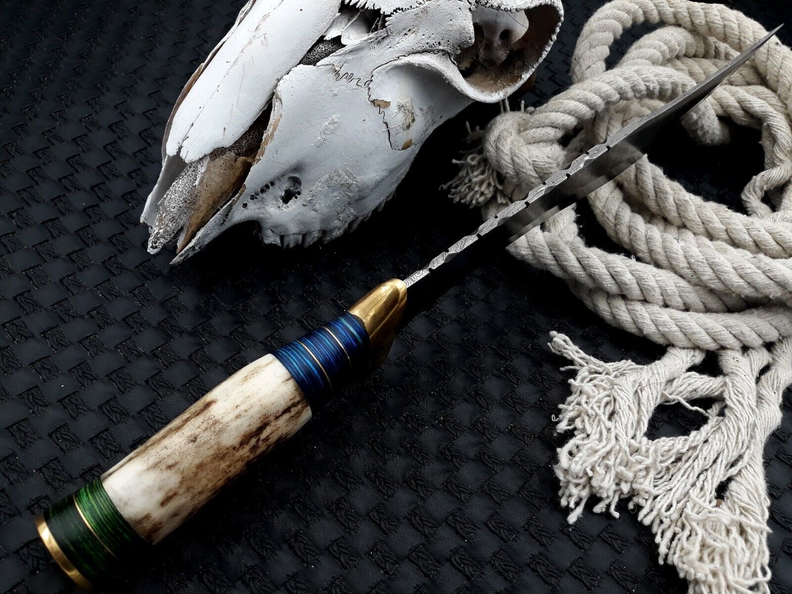 The 7-inch blade boasts a razor sharp Damascus edge, ideal for skinning, hunting, and general outdoor cutting tasks. Finished with a 5-inch handle crafted from genuine deer antler, this custom Damascus hunting knife offers a secure, natural grip and a timeless appearance. A hand-stitched leather sheath is included for safe storage and easy carry.