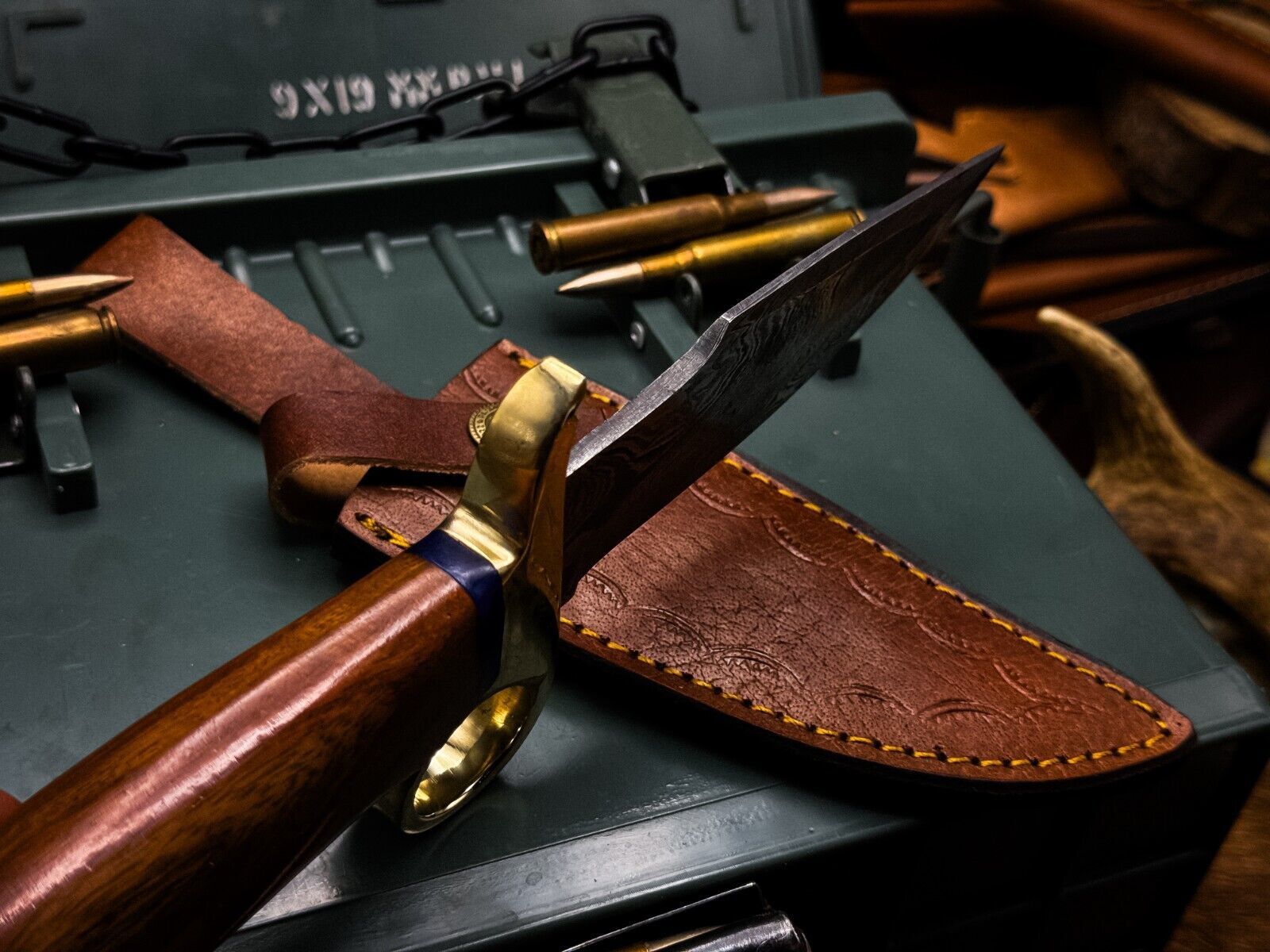 Crafted in the USA, the blade showcases the iconic Damascus wave pattern, a testament to expert heat treatment and forging. The twist-pattern hardwood handle ensures a firm, comfortable grip for long-term use in the field. Every knife is authenticated and comes complete with a custom leather sheath for protection and portability.