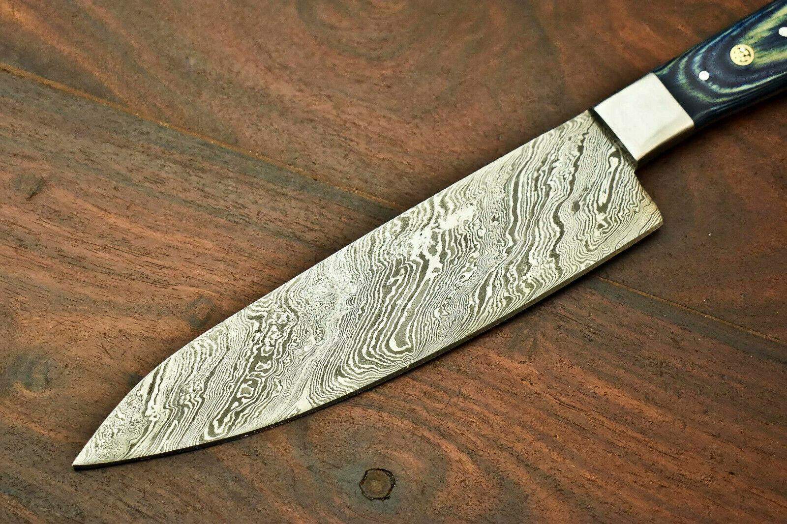 This handmade Damascus steel chef kitchen knife is a true blend of craftsmanship, performance, and elegance. With an overall length of 13 inches, it features an 8-inch razor-sharp blade and a 5.5-inch full tang handle crafted from durable hardwood. Designed for both professionals and enthusiasts, this knife is versatile enough for precise kitchen tasks and rugged enough for outdoor cooking or camping adventures.The blade is forged from a combination of 1095 high carbon steel and 15N20 nickel steel, folded repeatedly to form 384 striking layers. This traditional forging process creates the unique Damascus pattern while delivering exceptional strength, sharpness, and edge retention. Oil tempered to 58–60 HRC and sharpened at a precise 20-degree angle, the blade ensures lasting performance and reliable cutting power.Each knife is entirely handmade by skilled artisans, ensuring no two pieces are exactly alike. The polished hardwood handle offers a comfortable grip and excellent balance, making extended use effortless. Whether used as a chef knife, kitchen essential, or collector’s piece, this Damascus steel full tang knife is built to last and designed to impress. A true work of art that combines utility with timeless style.