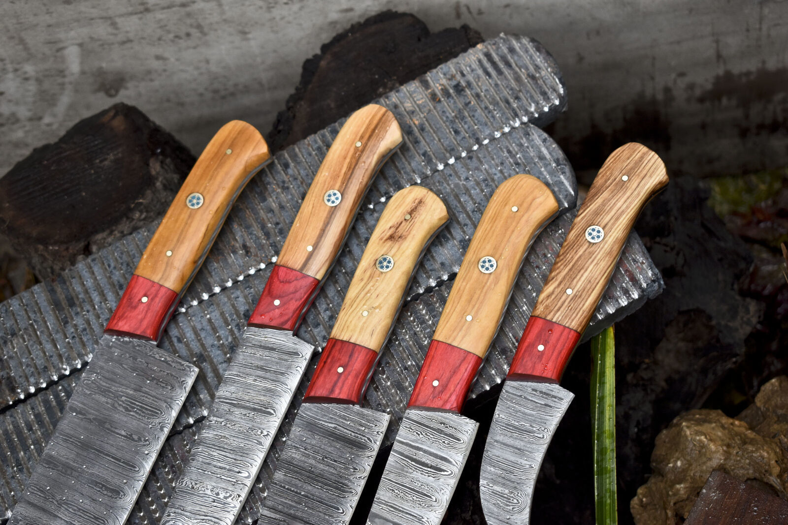Handmade Damascus Chef Knife Set of 5 – Ash Wood Handle with Wooden Bolster – Camping & Kitchen Rare