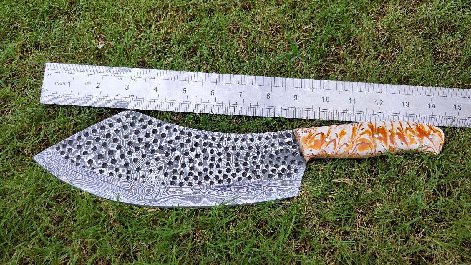 Unleash your culinary excellence with our Handmade Damascus Cleaver Knife, a masterpiece of artistry and precision designed for both professional chefs and passionate home cooks. Featuring a razor-sharp 9.0" blade with a modern Damascus design made from 512 layers of high-quality steel, this Serbian-style butcher knife delivers unmatched sharpness, durability, and visual appeal. The ergonomic 5.0" resin wood handle ensures a comfortable, secure grip, allowing you to chop, slice, dice, and smash with ease, while the hardness rating of 58–60 HRC guarantees long-lasting edge retention. Complete with a premium leather sheath for safe storage, this cleaver is not only a versatile and powerful kitchen tool but also a timeless work of art, making it a collector’s dream. Whether for personal use or as the perfect gift for a cooking enthusiast, this handcrafted Damascus cleaver will be cherished for a lifetime.