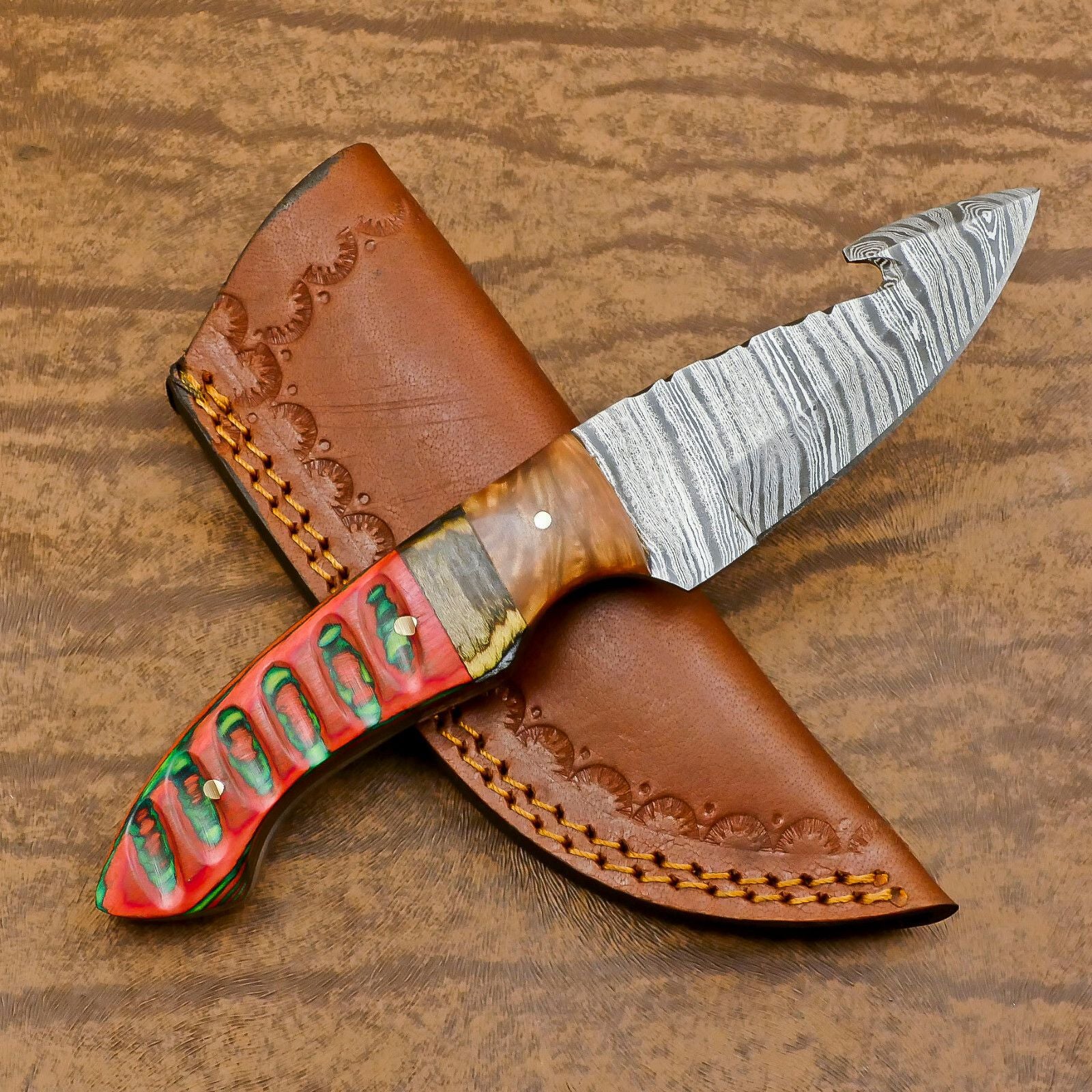 Handmade Damascus Gut Hook Skinner Hunting Knife with Resin and Wood Handle – Custom Fixed Blade Knife