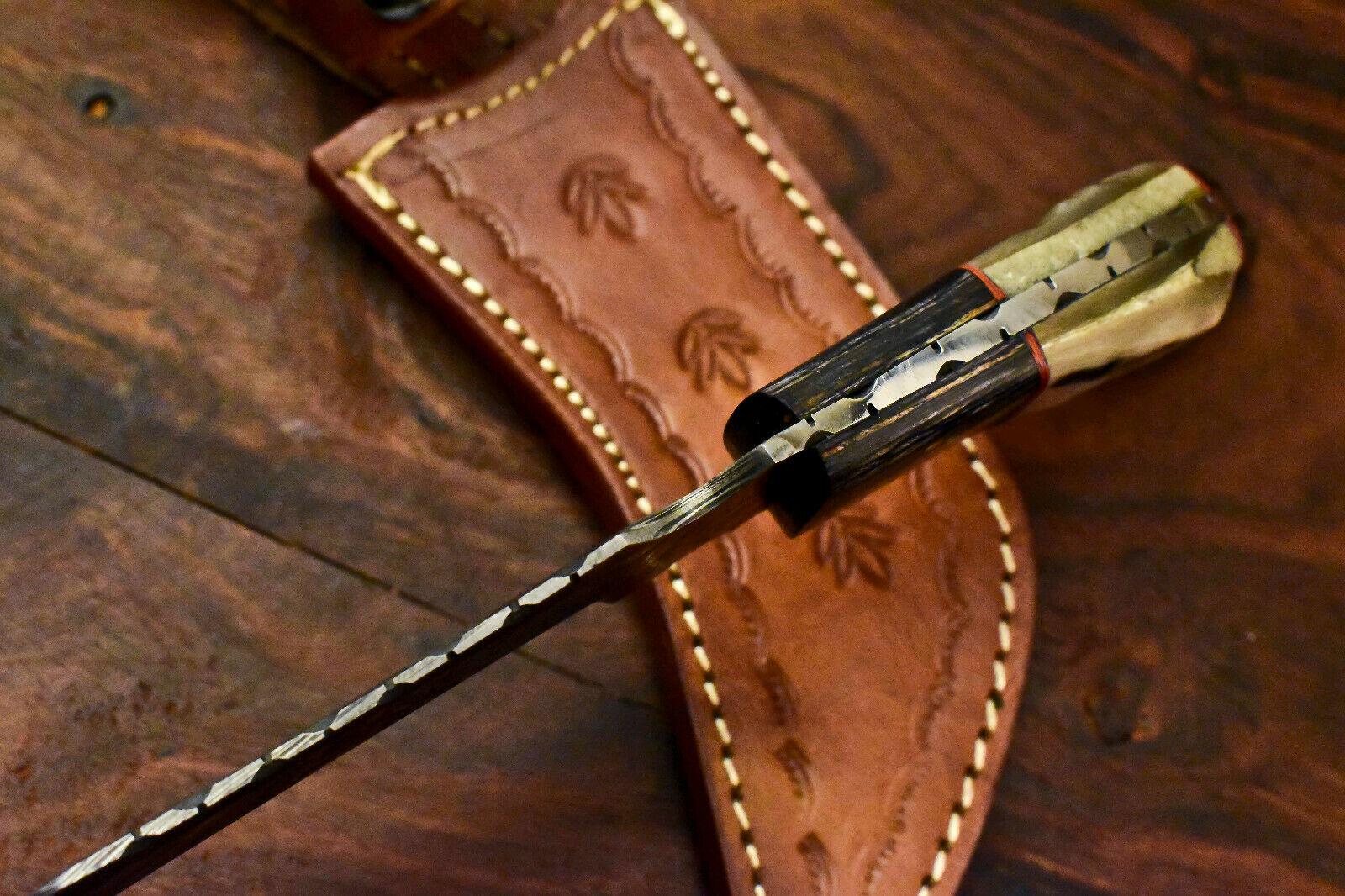 This full tang damascus karambit features a genuine Ram’s Horn handle, offering both durability and a distinctive natural appearance.The handle is shaped for a comfortable and secure grip, enhancing control during outdoor tasks. Paired with the included sheath, this karambit with sheath is ready for safe carry and storage.