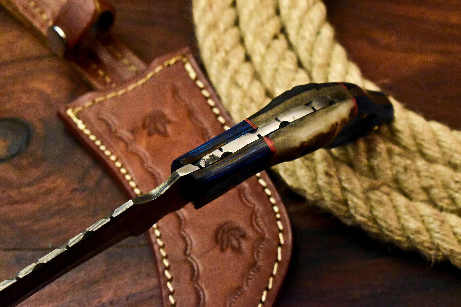 This full tang damascus karambit features a genuine Ram’s Horn handle, offering both durability and a distinctive natural appearance.The handle is shaped for a comfortable and secure grip, enhancing control during outdoor tasks. Paired with the included sheath, this karambit with sheath is ready for safe carry and storage.