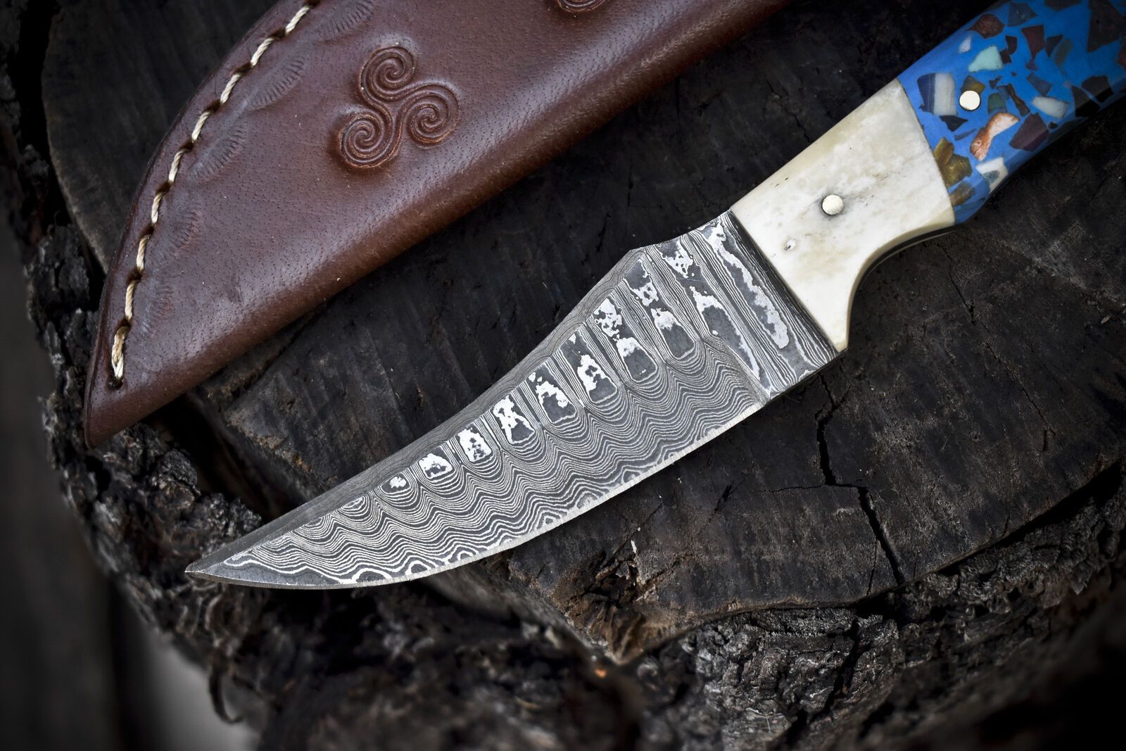 Whether you're dressing game or setting up camp, this handmade skinner damascus knife offers sharpness, durability, and beauty in one. Includes a hand-tooled leather sheath for safe carry. This knife is a perfect representation of functional art for anyone seeking a damascus skinner hunting knife with rare features.