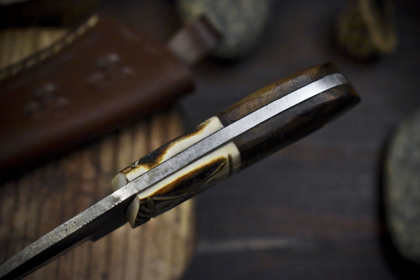 Experience the perfect combination of craftsmanship and functionality with this handmade Damascus skinner knife featuring a striking twist pattern. The blade is expertly forged from a blend of 1095 and 15N20 steel, acid-etched to reveal a beautiful contrast of deep blacks and bright silvers, making the blade not only durable but visually captivating. This skinner knife includes a precise gut hook, designed for safe and controlled field dressing of game such as deer and elk, making it an essential tool for hunters. The handle is crafted from rich walnut wood, providing a comfortable and secure grip, complemented by its natural beauty. The blade is oil tempered to 58-60 HRC, ensuring long-lasting sharpness and strength. This knife comes with a hand-tooled thick leather sheath that is robust enough to withstand years of tough outdoor use. Each knife is fully handmade, without CNC machining or precut blanks, guaranteeing a unique piece with handcrafted details. This Damascus skinner hunting knife is an ideal choice for hunters and outdoor enthusiasts seeking reliability and style in one tool.