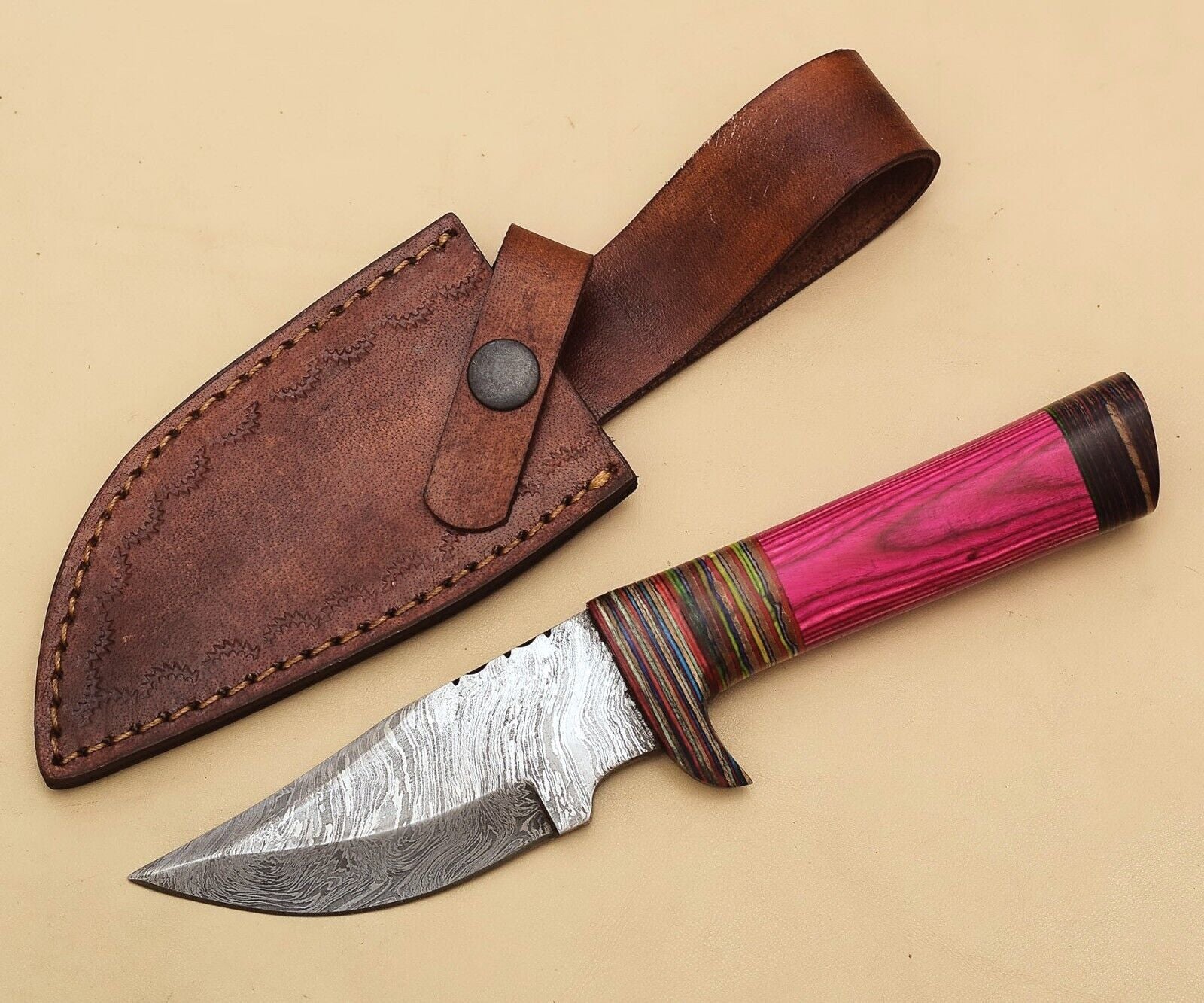 Handmade Damascus Skinner Knife with Pakka Wood Handle – 8 Inch Hunting and Camping Blade with Leather Sheath