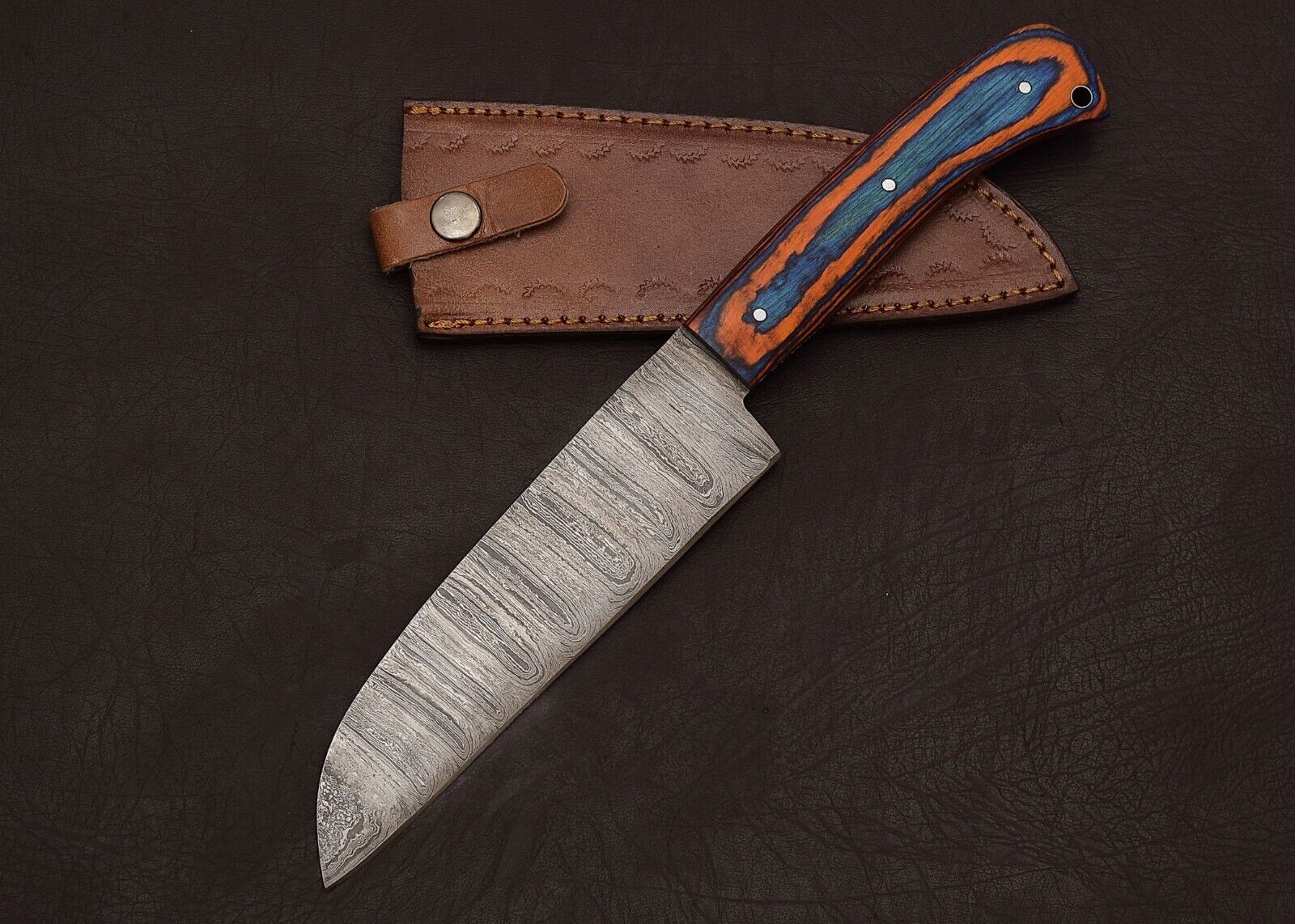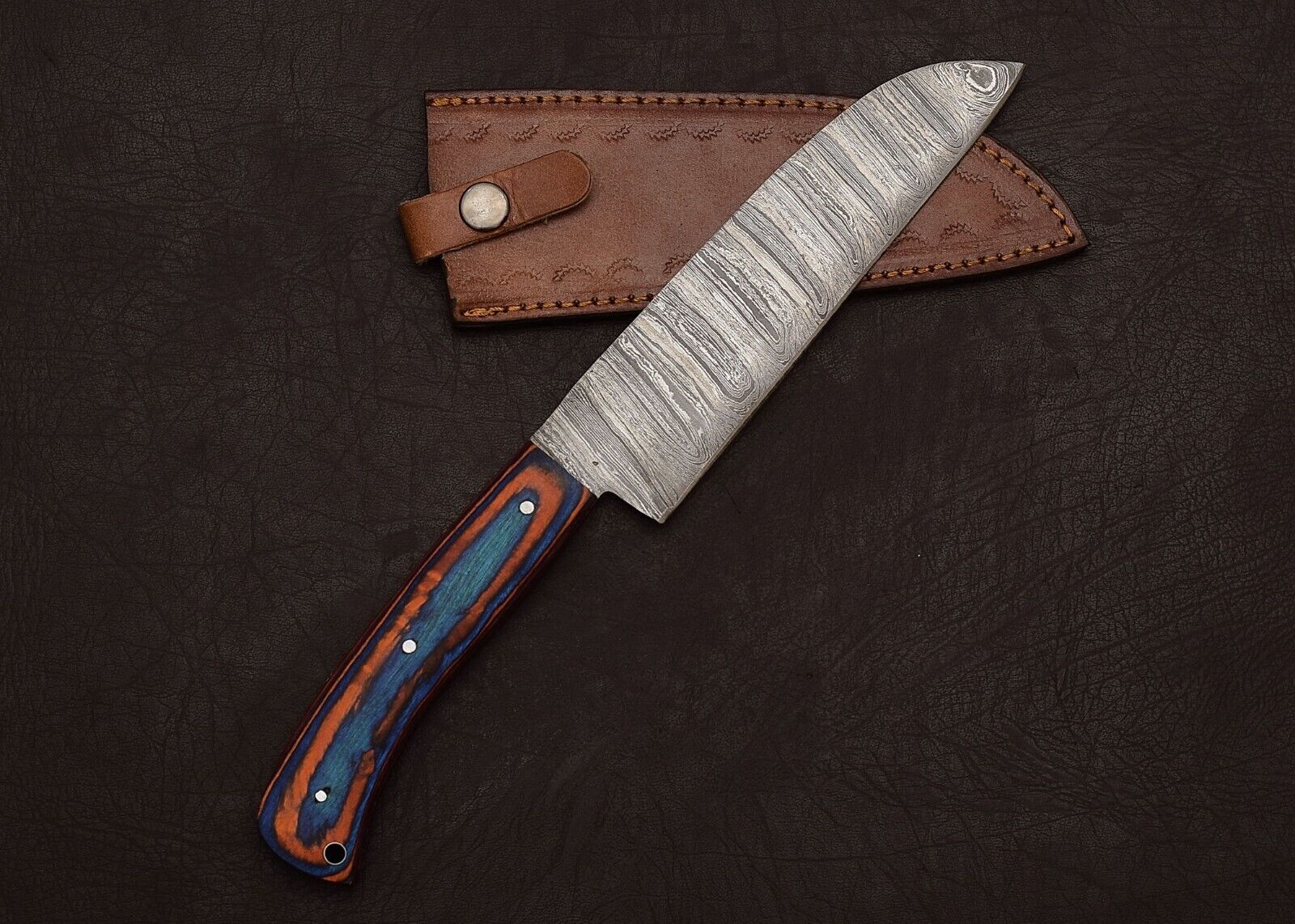 This Custom Handmade Damascus Steel Outdoor Kitchen Chef Knife combines elegance with performance, making it the perfect tool for both culinary and outdoor use. The 7-inch Damascus steel blade (15N20) is hand-forged to ensure razor-sharp precision, excellent durability, and a striking Damascus pattern that makes each knife truly unique. Its 5-inch Pakka Wood handle with a wood bolster is ergonomically designed to provide a secure and comfortable grip, giving you full control whether you are preparing meals in the kitchen or handling tough outdoor tasks. Perfect as a chef knife, hunting knife, bowie knife, skinning knife, camping knife, or survival knife, this versatile blade is a must-have for any enthusiast.