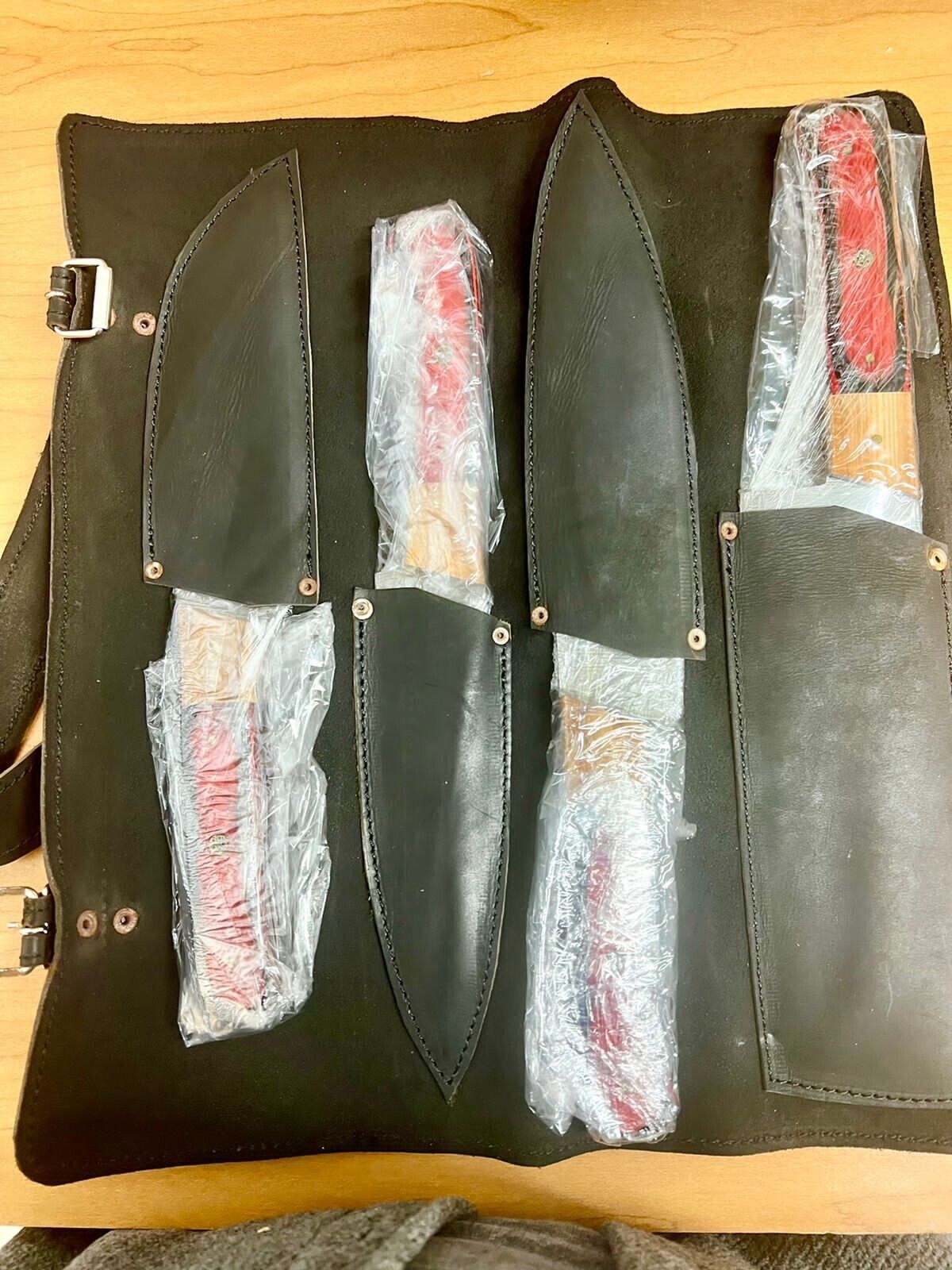 The ergonomic wooden handles with steel bolsters ensure a secure and comfortable grip, offering full control whether you're a professional chef or home cook. With a Rockwell hardness of 55–58 HRC, these knives provide reliable performance under intense kitchen conditions. The set includes a durable leather sheath for safe storage and transport.
