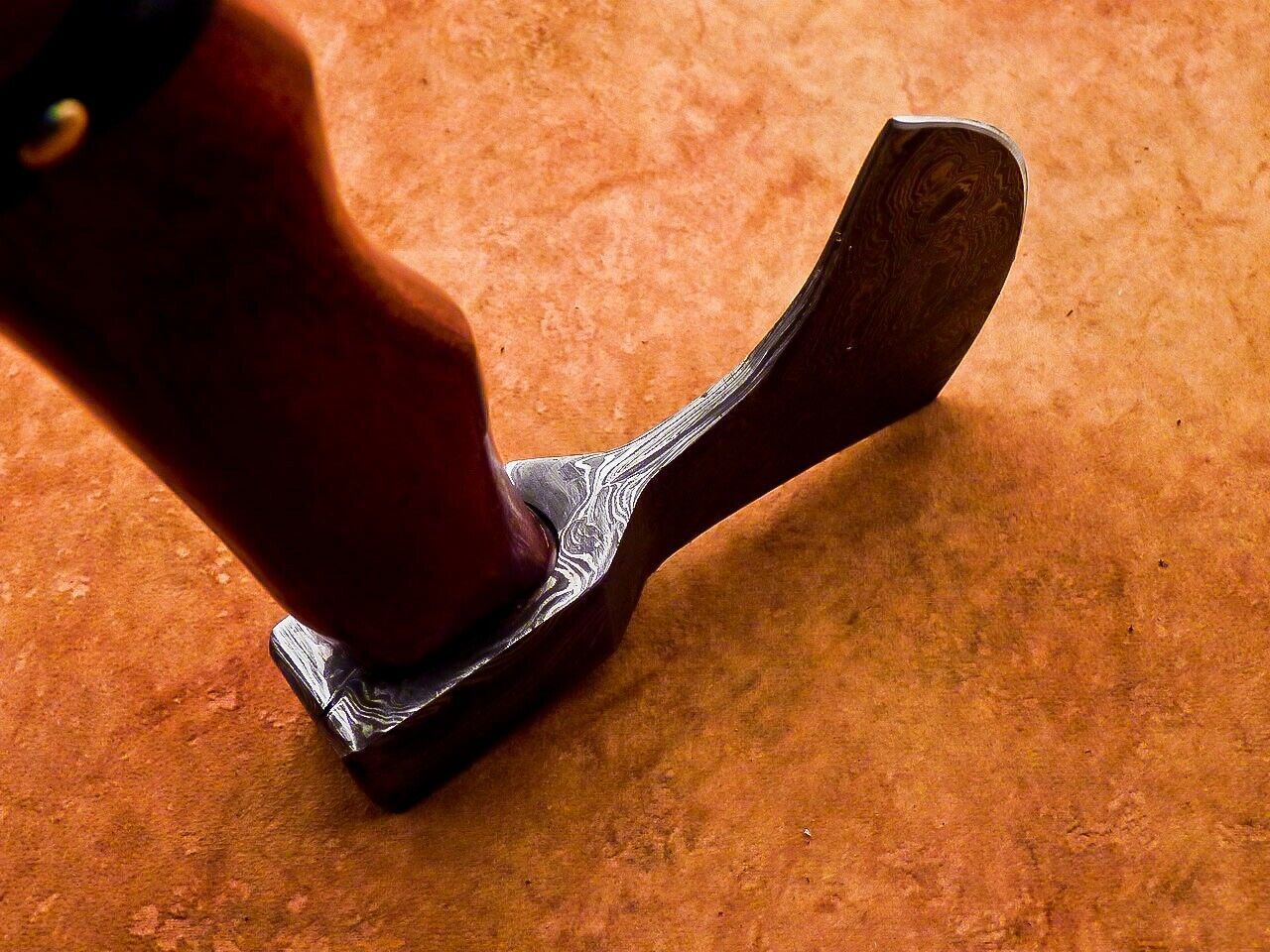 This Damascus tomahawk axe includes a premium leather sheath for safe storage, making it ideal as a collector’s piece, camping axe, or custom hunting tool. Each axe is unique due to the hand-forged process, and slight variations in pattern and sheath may occur. Perfect for enthusiasts of forged Damascus steel tools, this axe combines beauty, precision, and functionality in one collectible item.