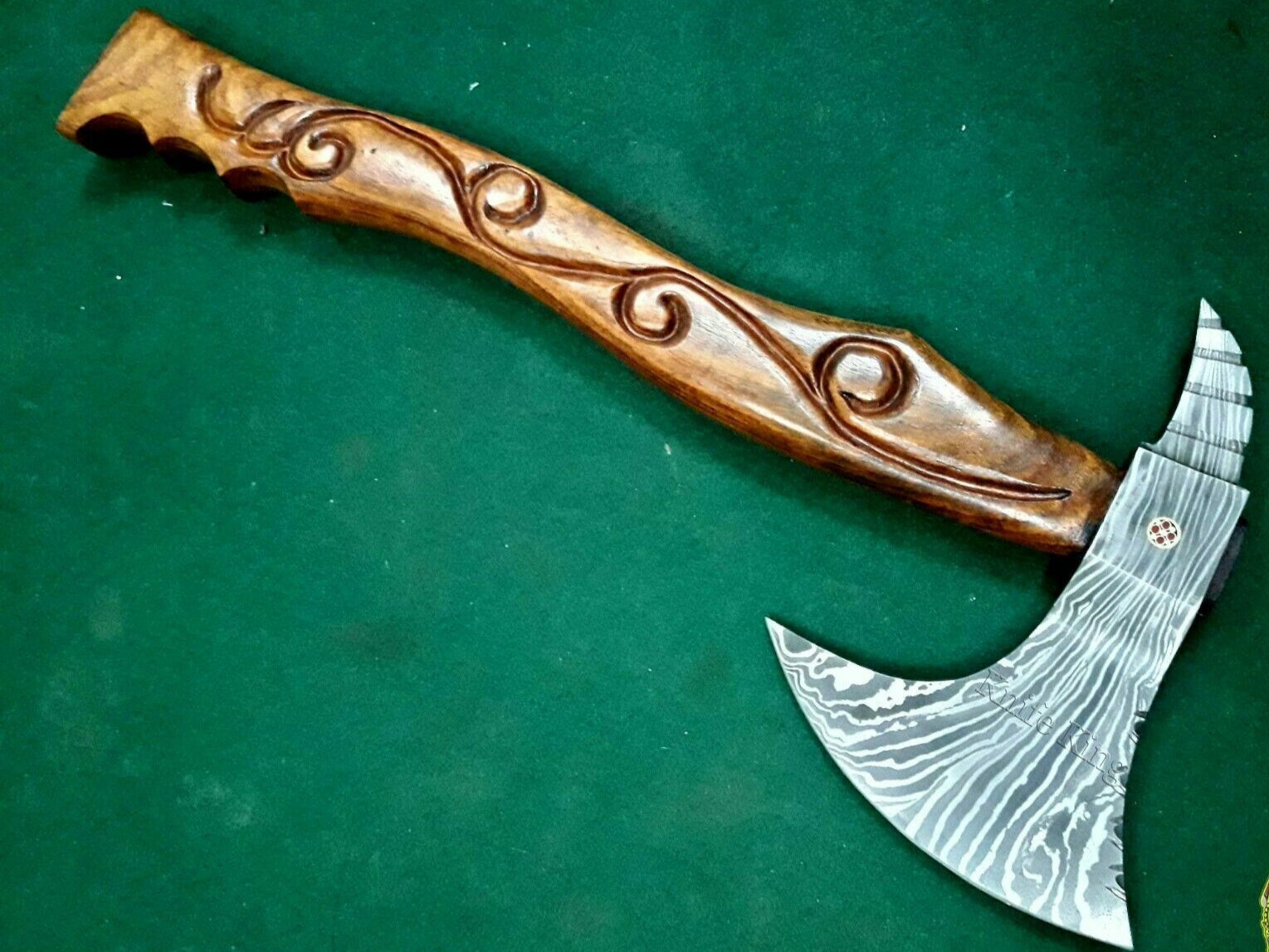 This handmade Damascus steel axe tomahawk hatchet is a true masterpiece of craftsmanship, forged with care to deliver both beauty and performance. The blade is made from high-quality Damascus steel, featuring over 500 layers that create striking natural patterns while ensuring strength, sharpness, and durability. Designed for both collectors and outdoor enthusiasts, this axe combines functionality with timeless style.