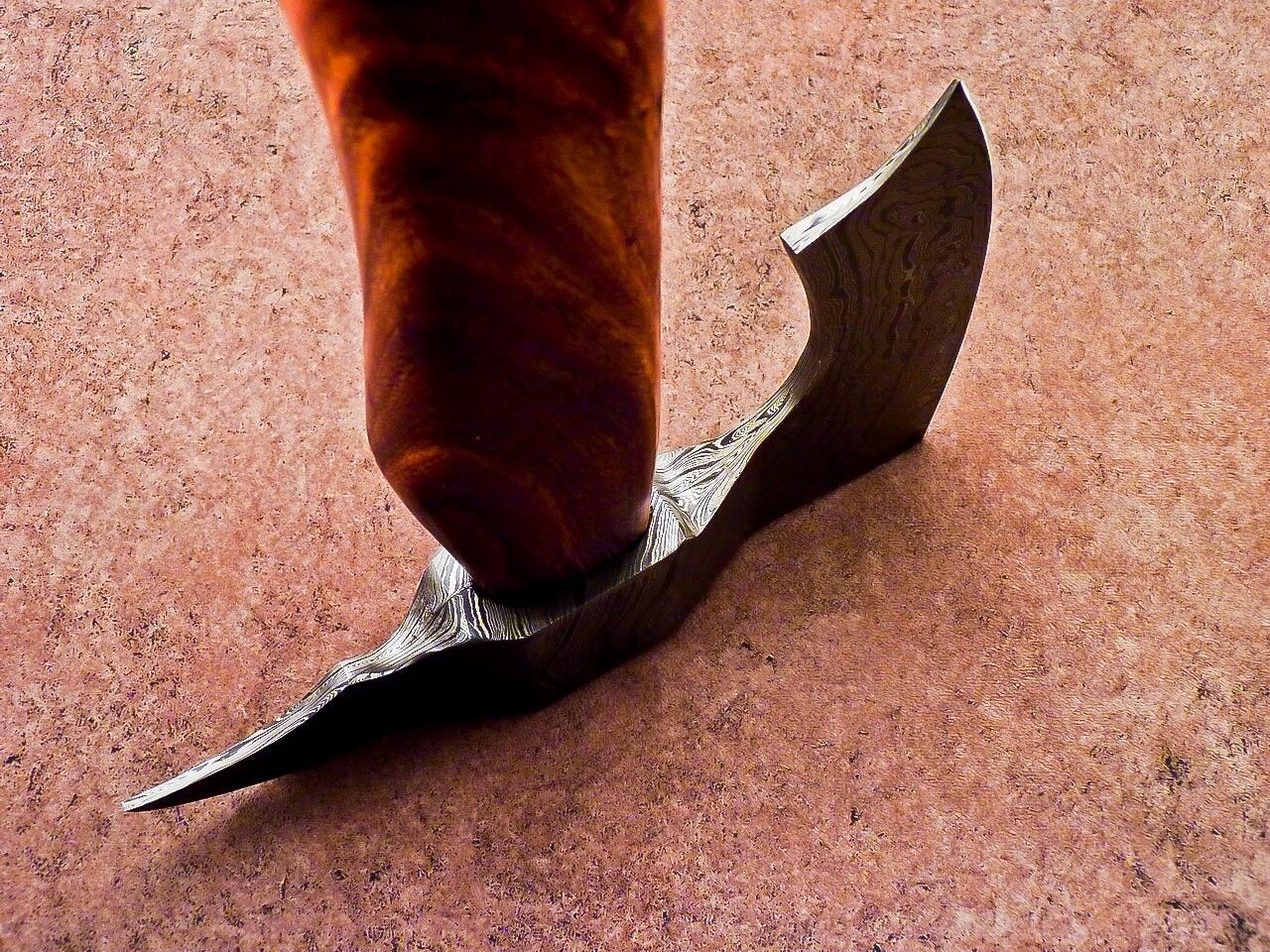 This hand forged Damascus steel axe is a true masterpiece of craftsmanship, built for strength, durability, and beauty. With an overall length of 20 inches, it is perfectly balanced for chopping, hunting, camping, or display. The axe features a 5-inch blade with an impressive 9-inch cutting width, forged from 1095 and 15N20 high carbon steel, folded and layered more than 512 times to create the unique Damascus pattern. This forging process produces an exceptionally sharp and resilient edge, with a Rockwell hardness of 50–54 along the cutting edge and 42–45 along the spine.