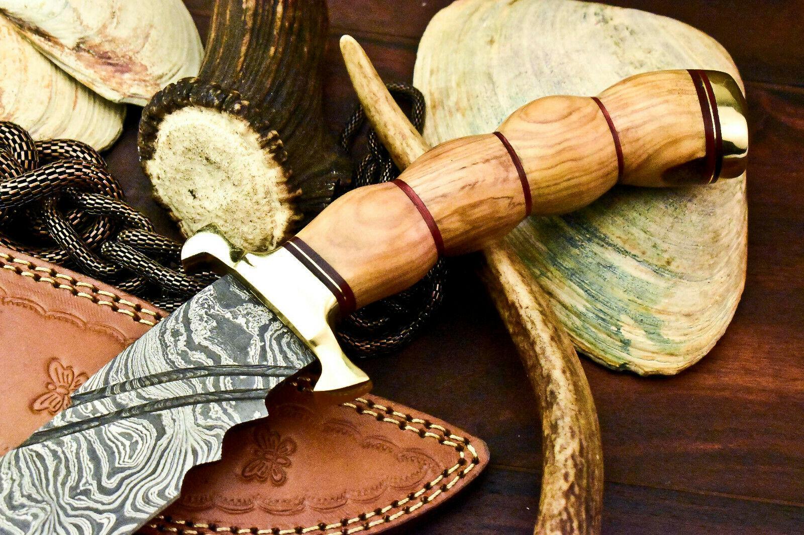 Handmade Damascus Steel Bowie Knife – 12.5" Olive Wood Handle Hunting Knife