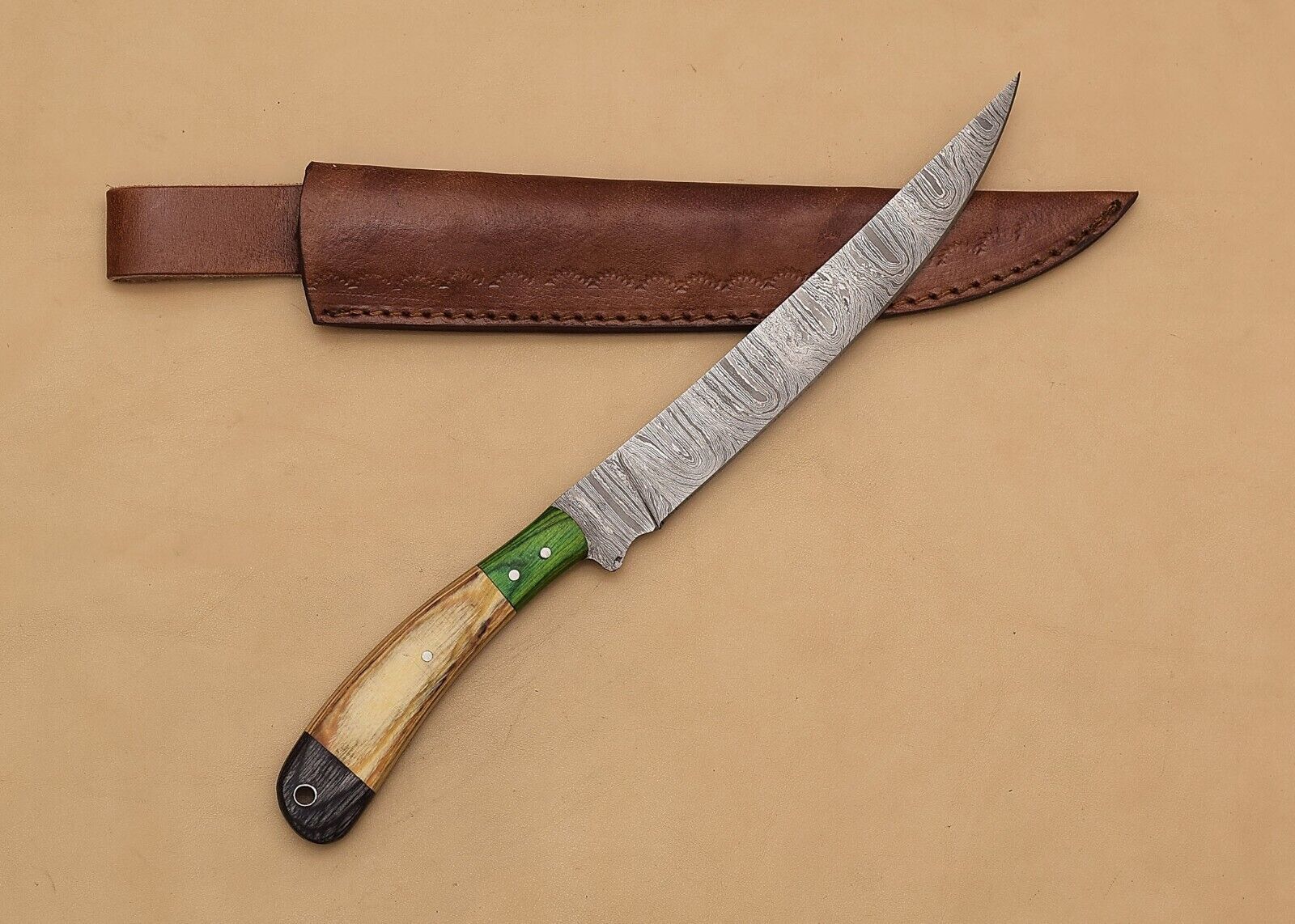 Custom Handmade Damascus Steel Kitchen Chef Fillet Knife designed for both professional chefs and outdoor enthusiasts. The 8-inch razor-sharp Damascus steel blade (15N20) ensures long-lasting durability and precision cutting, while the 5-inch Pakka wood handle with wood bolster provides a secure and comfortable grip. This versatile knife is perfect for kitchen use, hunting, camping, skinning, survival, or as a collector’s piece.