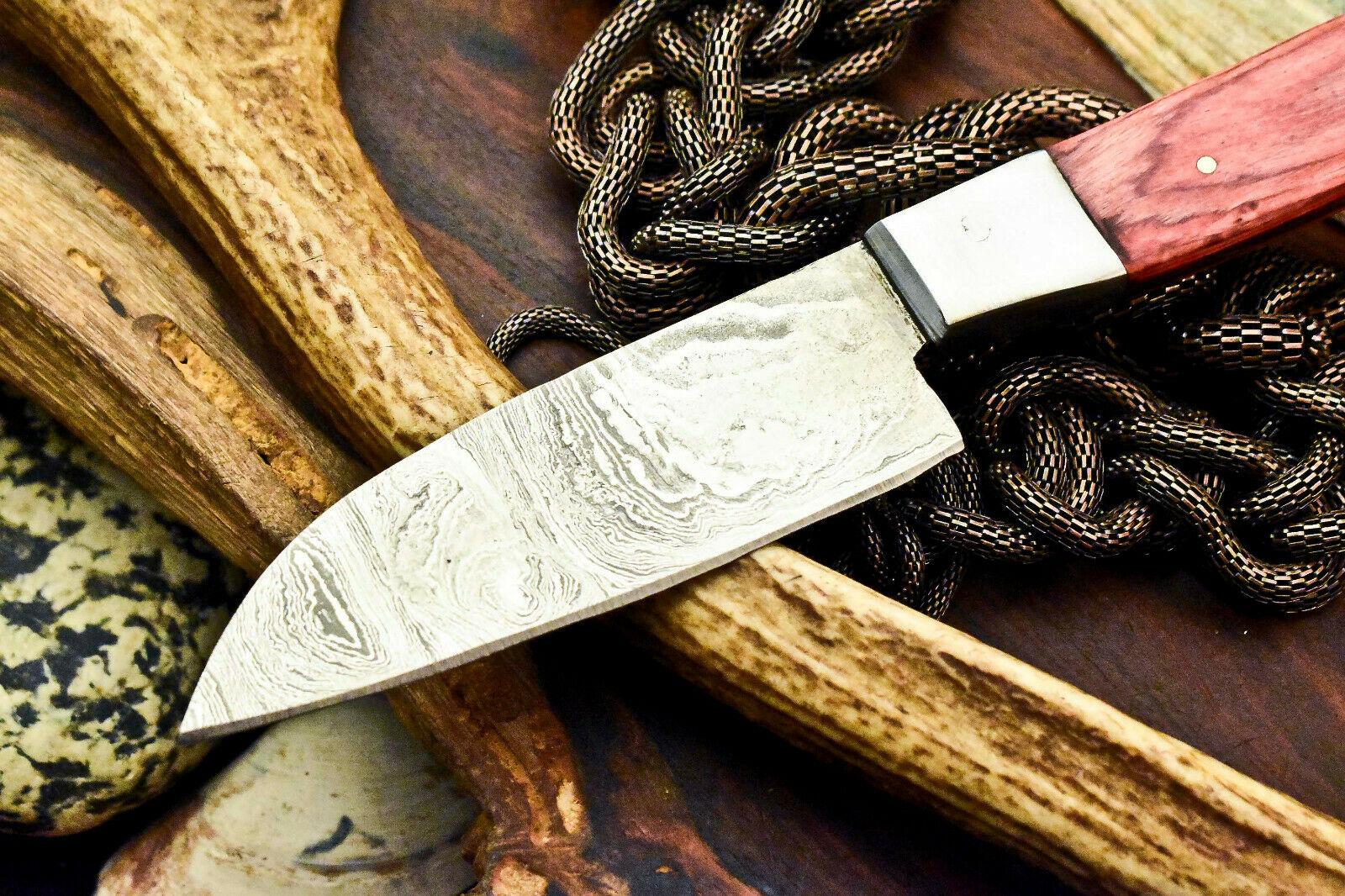 This gorgeous handmade Damascus steel chef and hunting knife is a true masterpiece for professionals, collectors, and outdoor enthusiasts. With an overall length of 9 inches, it features a perfectly balanced 4.5-inch blade and a 4.5-inch handle, making it versatile for both kitchen use and outdoor adventures. The blade is crafted from 384 layers of 1095HC and 15N20 nickel carbon, forged and folded by hand to create the striking Damascus pattern. Oil tempered to 58–60 HRC and sharpened at a precise 20-degree edge, this knife ensures long-lasting sharpness, strength, and reliability. The stunning hardwood handle is polished and secured with durable epoxy for a comfortable and firm grip. Each knife is 100% handmade, making every piece unique with its own natural variations. Whether for cooking, camping, or hunting, this Damascus blade combines elegance, durability, and superior craftsmanship in one functional work of art.