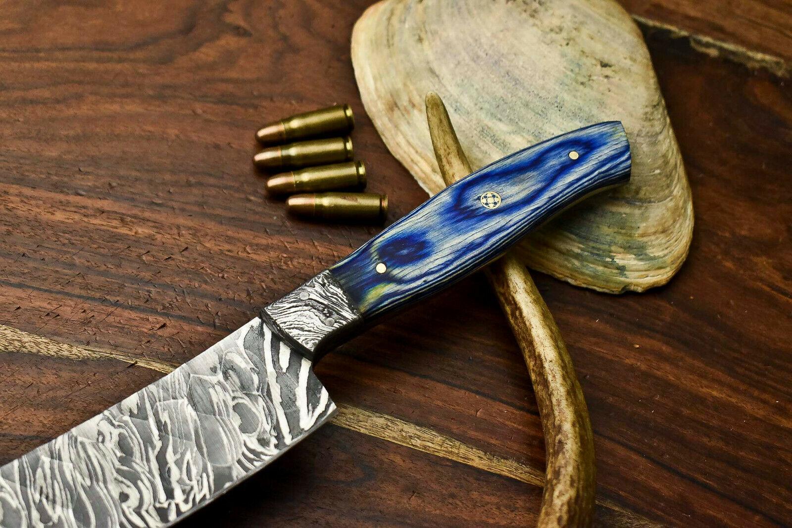This Handmade Damascus Steel Chef Kitchen Full Tang Knife with Hardwood Handle is a fine example of traditional craftsmanship and superior cutting performance. The blade is crafted from real Damascus steel, made by folding layers of 1095 high carbon steel and 15N20 nickel steel together. Our blades are not just acid etched; they are truly forged with 384 layers to create the signature Damascus pattern. When burned in acid, the nickel takes on a satin finish while the high carbon darkens, producing striking black and gray contrasts. This process reveals the natural flow of steel layers, making each knife unique in appearance and strength.After forging, each knife is carefully hand-polished to a smooth, satin finish and then sharpened to a razor edge. The full tang design ensures durability and balance, while the hardwood handle offers both comfort and beauty. No CNC machines are used; every detail is shaped and finished by hand, making each piece one of a kind. This chef knife is not only functional in the kitchen but also a collectible piece of art. Perfect for professional chefs, home cooks, or as a thoughtful handmade gift, it combines beauty, durability, and performance in one tool.