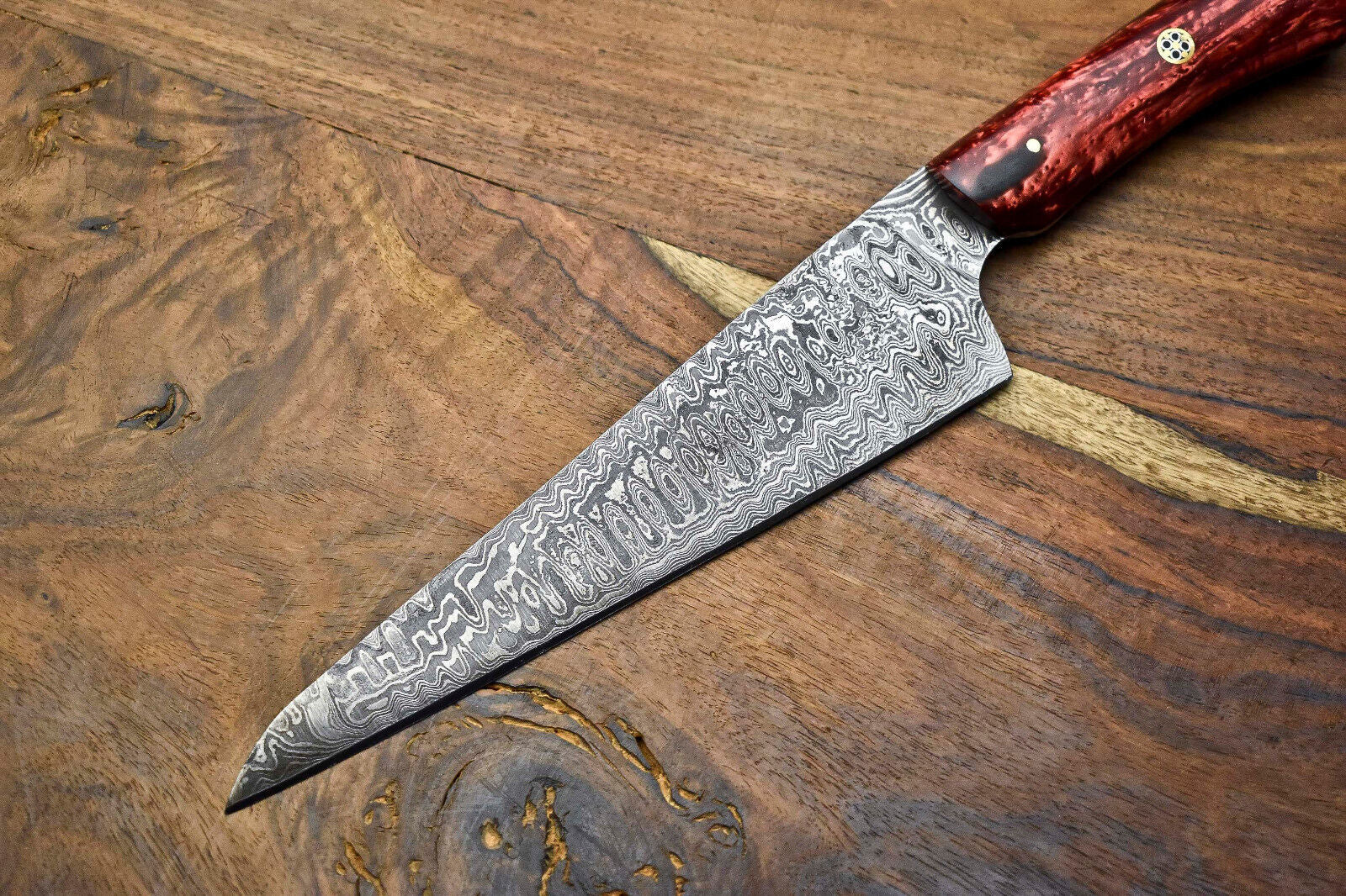 This Custom Handmade Damascus Steel Chef Knife is a stunning and powerful tool, designed for performance and crafted with precision. Featuring a full tang construction, this chopper-style knife offers superior strength, balance, and control — ideal for heavy-duty kitchen tasks or outdoor cooking. Each blade is forged from real Damascus steel, not just acid etched for looks.Our Damascus is created by combining 1095 high carbon steel with 15N20 nickel carbon, folded multiple times to form 384 beautiful layers. After forging, the blade is acid-etched to reveal the signature Damascus pattern — the nickel layers shine with a satin finish, while the high carbon darkens to a deep gray, offering a stunning contrast. The blade edge is sharpened to a fine point, and the handle is hand-polished to enhance grip and aesthetics.Every knife is 100% handmade, with no CNC machines involved, giving each piece a unique look and character. Whether you're slicing meat in the kitchen or prepping food in the outdoors, this knife is made to perform and impress.