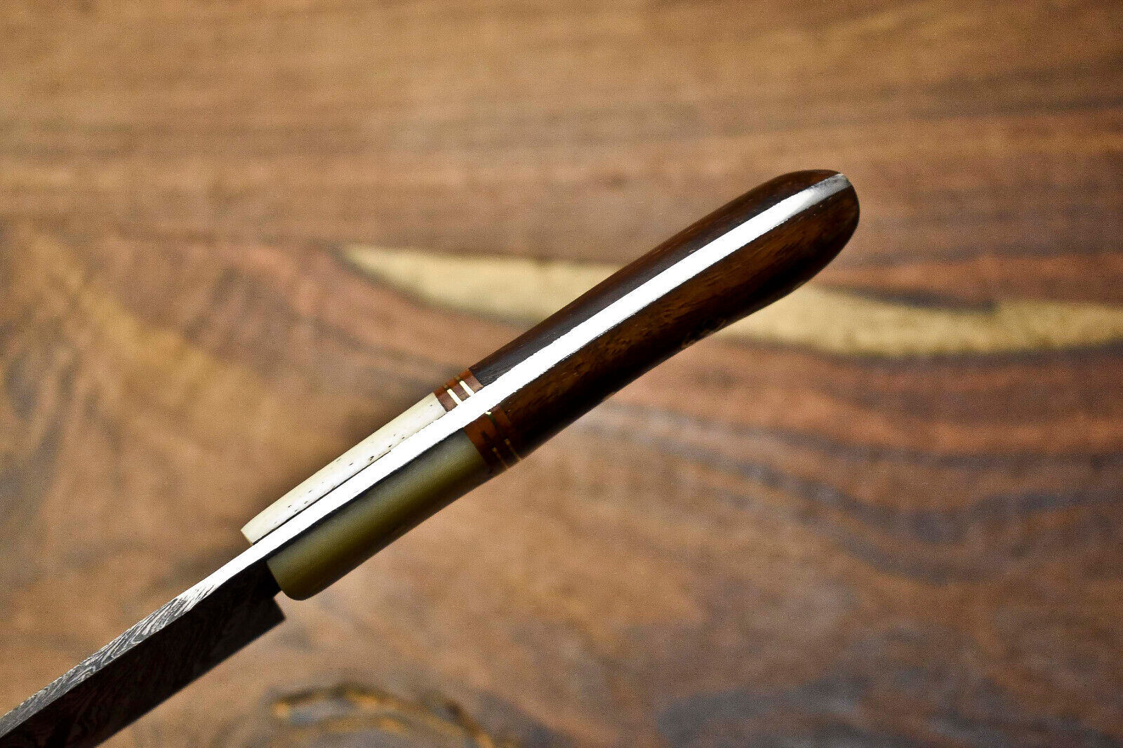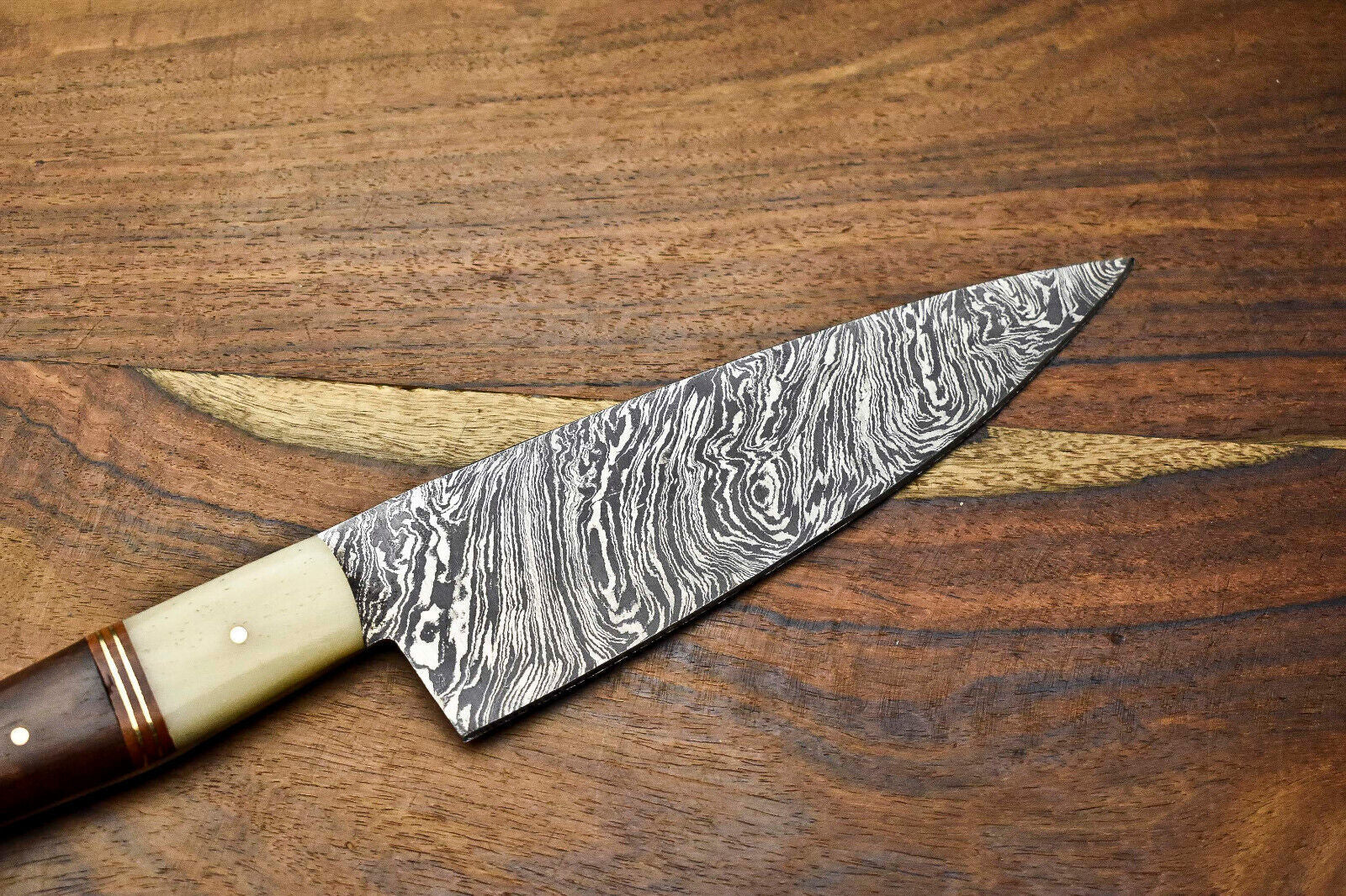 This Custom Handmade Damascus Steel Chef Knife is a versatile tool designed for both kitchen and outdoor use. Crafted with a full tang construction, it delivers exceptional strength, balance, and control for precision cutting. Whether you're cooking indoors or outdoors, this sport-style utility knife is up to the task.Forged from real Damascus steel — not a surface etch — this blade combines 1095 high carbon steel with 15N20 nickel carbon, folded multiple times to produce 384 distinctive layers. After forging, the blade is acid-etched, turning the nickel layers satin and the high carbon layers dark gray, revealing the classic Damascus pattern. This isn’t just for beauty — it speaks to the strength and craftsmanship of the steel.Each knife is 100% handmade, with no CNC machines involved, making every piece unique. After forging, the handle is polished to a smooth finish, and the blade is sharpened to a precise edge. This knife is not just a tool — it's a functional piece of art, ideal for chefs, collectors, or outdoor cooking enthusiasts.