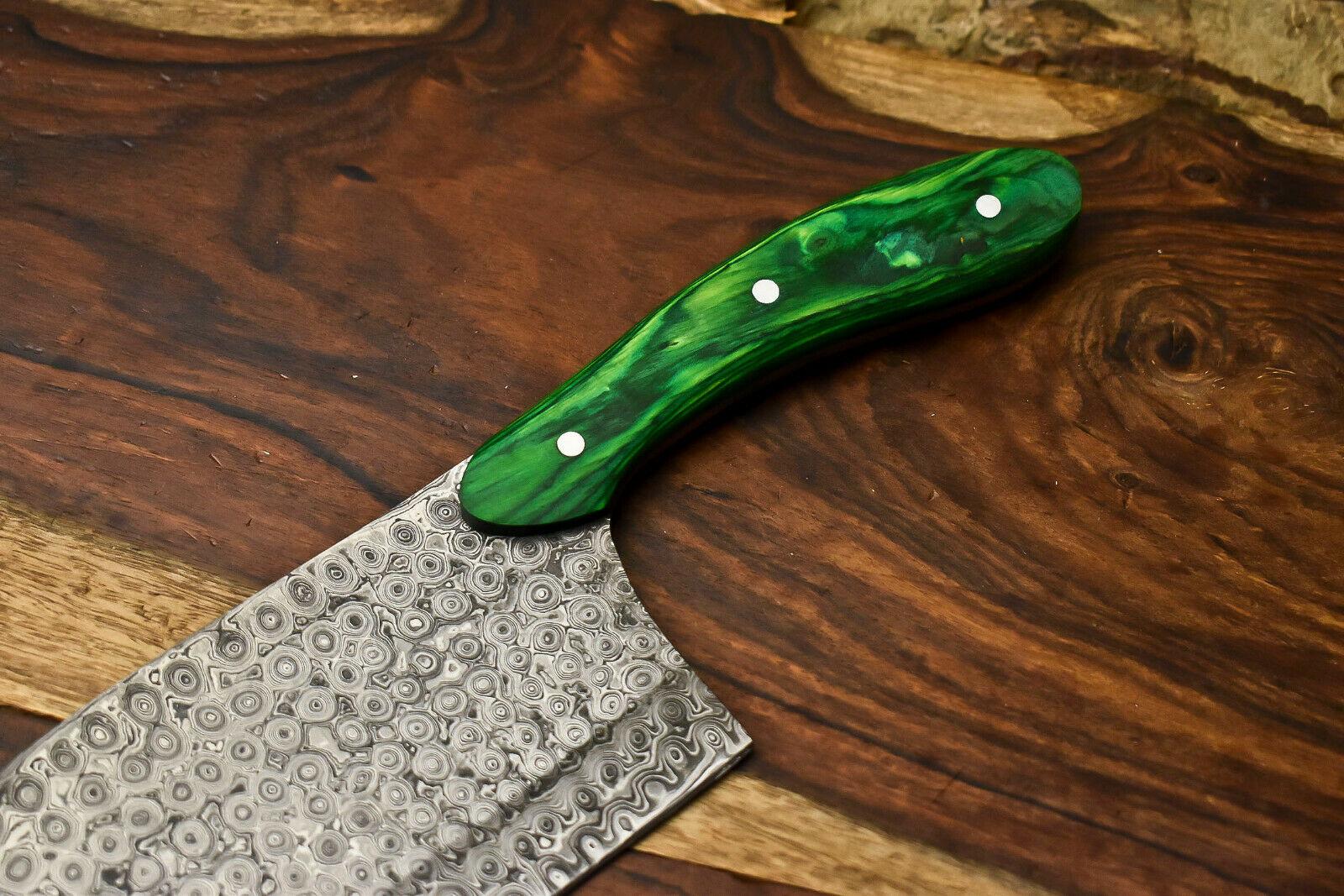 This Handmade Damascus Steel Chef Knife is crafted with precision and built for performance in the kitchen. Featuring a full tang design and a durable hardwood handle, this chopper knife delivers strength, balance, and control for all your cutting needs. The blade is forged from genuine Damascus steel, created by layering 1095HC and 15N20 nickel carbon steel. Our blades are folded and heat-treated to achieve 384 layers, resulting in a striking pattern that’s both functional and beautiful. The acid-etching process reveals the unique layers, showcasing the true character of Damascus steel. Each knife is carefully polished, and the razor-sharp edge ensures smooth cutting, chopping, and slicing. Perfect for professional chefs, cooking enthusiasts, and collectors alike, this handmade chopper knife combines elegance with utility, making it a must-have addition to any kitchen.