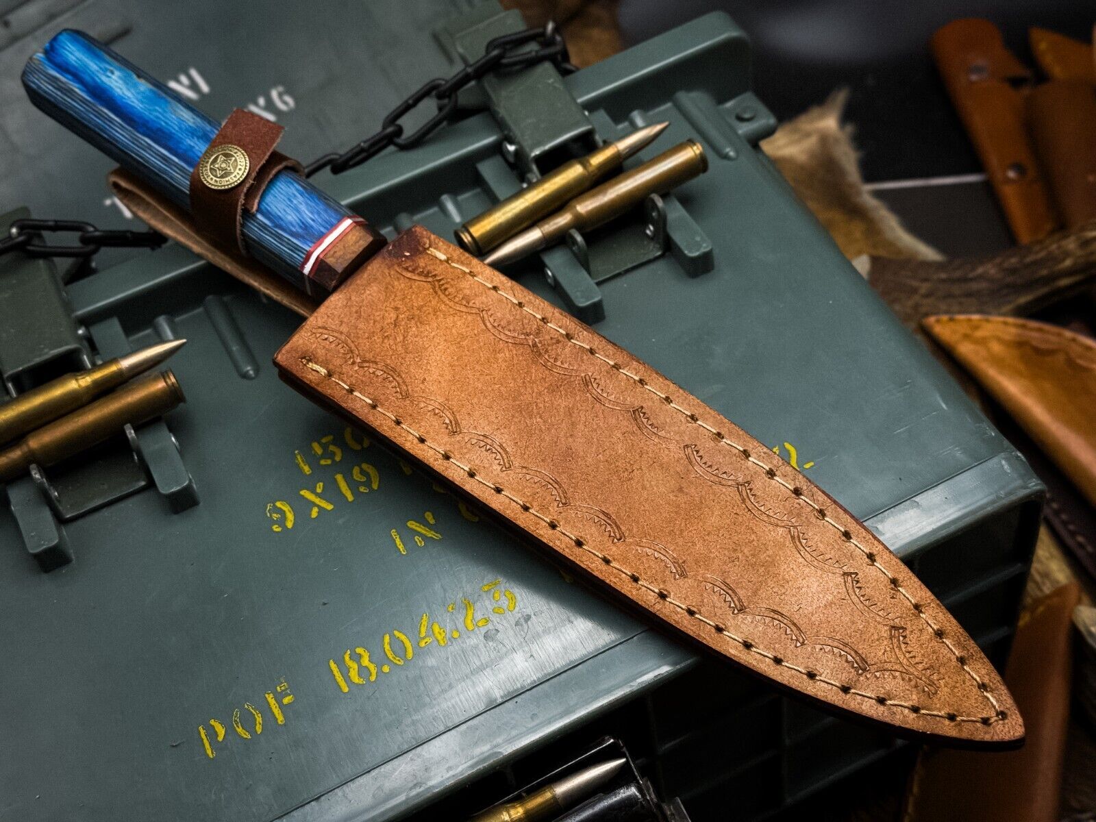 The drop point blade is full tang, ensuring balance and durability in every cut. A natural wood handle provides a secure and comfortable grip for both left- and right-handed users. Finished with a custom leather sheath, this knife is ideal for storage, protection, and gifting.