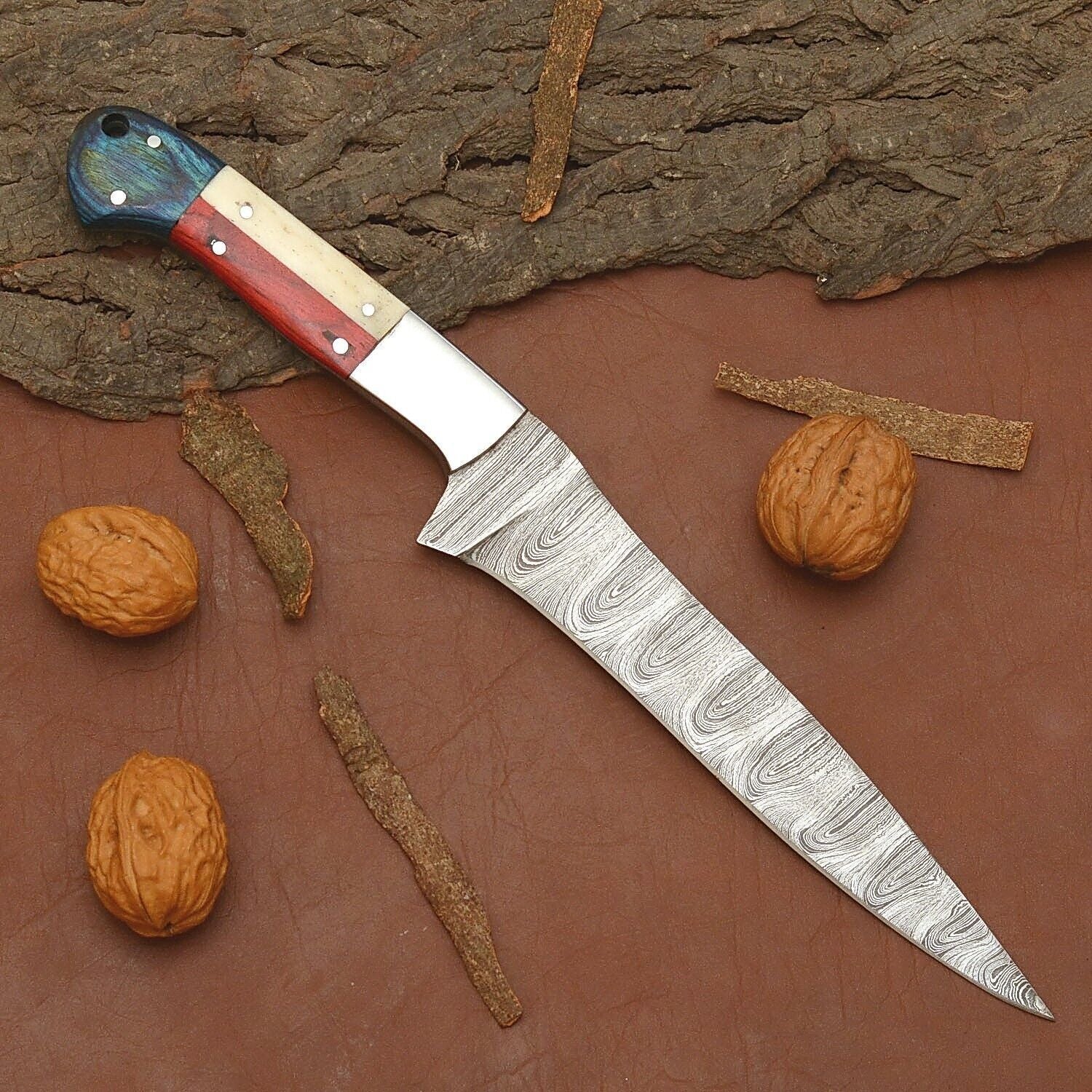 Elevate your culinary and outdoor experience with this Custom Handmade Damascus Steel Chef Knife. Expertly forged from premium Damascus steel (15N20), this knife delivers exceptional durability, sharpness, and long-lasting edge retention.