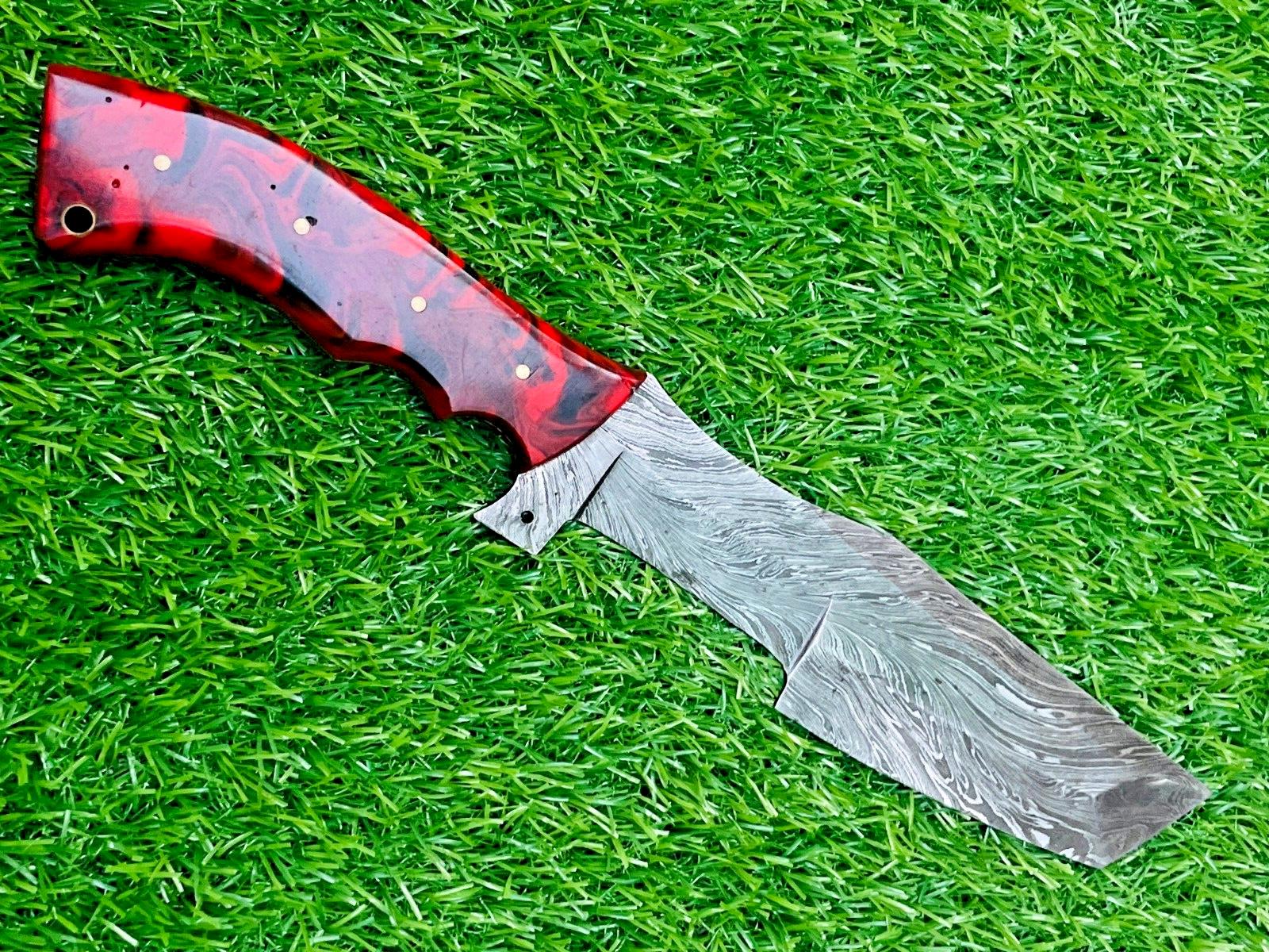 This Handmade Damascus Steel Feather Pattern Tracker Knife is a premium-quality outdoor tool, designed for hunting, camping, bushcraft, and everyday carry. With an overall length of approximately 13 inches, a 7-inch razor-sharp blade, and a 6-inch sturdy resin handle, this knife offers both functionality and style. Hand-forged from high-quality Damascus steel, the blade features a stunning feather pattern, showcasing the artistry and strength of multiple steel layers combined into a single billet. Known for its edge retention, durability, and unique design, this knife is equally suited for heavy-duty outdoor tasks and fine cutting work. The full tang construction provides superior strength and balance, ensuring a reliable grip during use. Its ambidextrous design makes it suitable for both left and right-handed users, while the resin handle offers comfort, slip resistance, and durability in all conditions. This knife also comes with a premium leather sheath for secure storage and easy portability. Whether you are a hunter, camper, survivalist, or knife collector, this handmade Damascus tracker is a perfect blend of performance and craftsmanship. Strong, versatile, and built to last, it is not only a dependable survival tool but also a beautiful collectible piece for enthusiasts of modern fixed-blade knives.