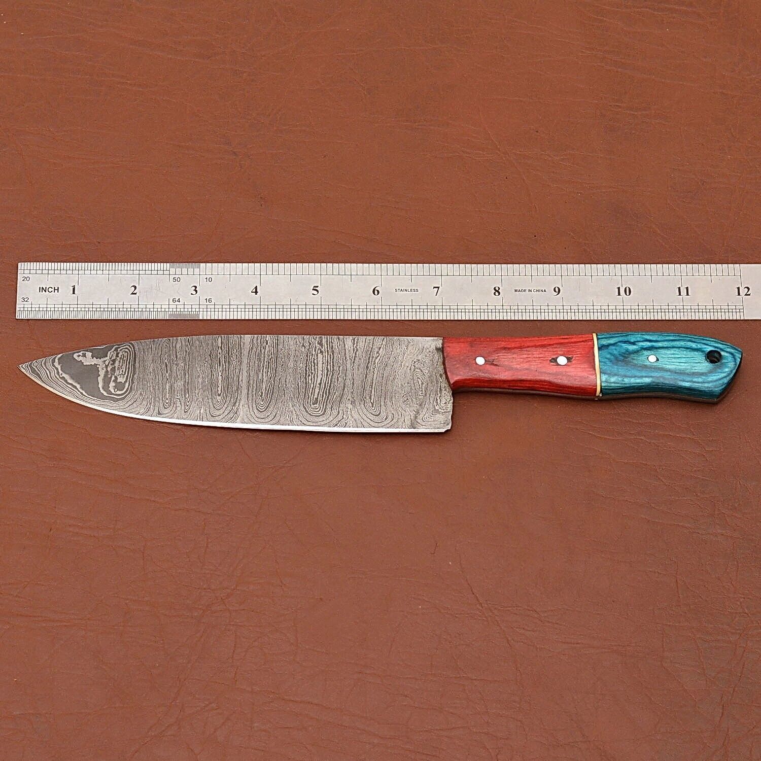 Handmade Damascus Steel Fillet & Chef Knife with Pakka Wood Handle and Leather Sheath