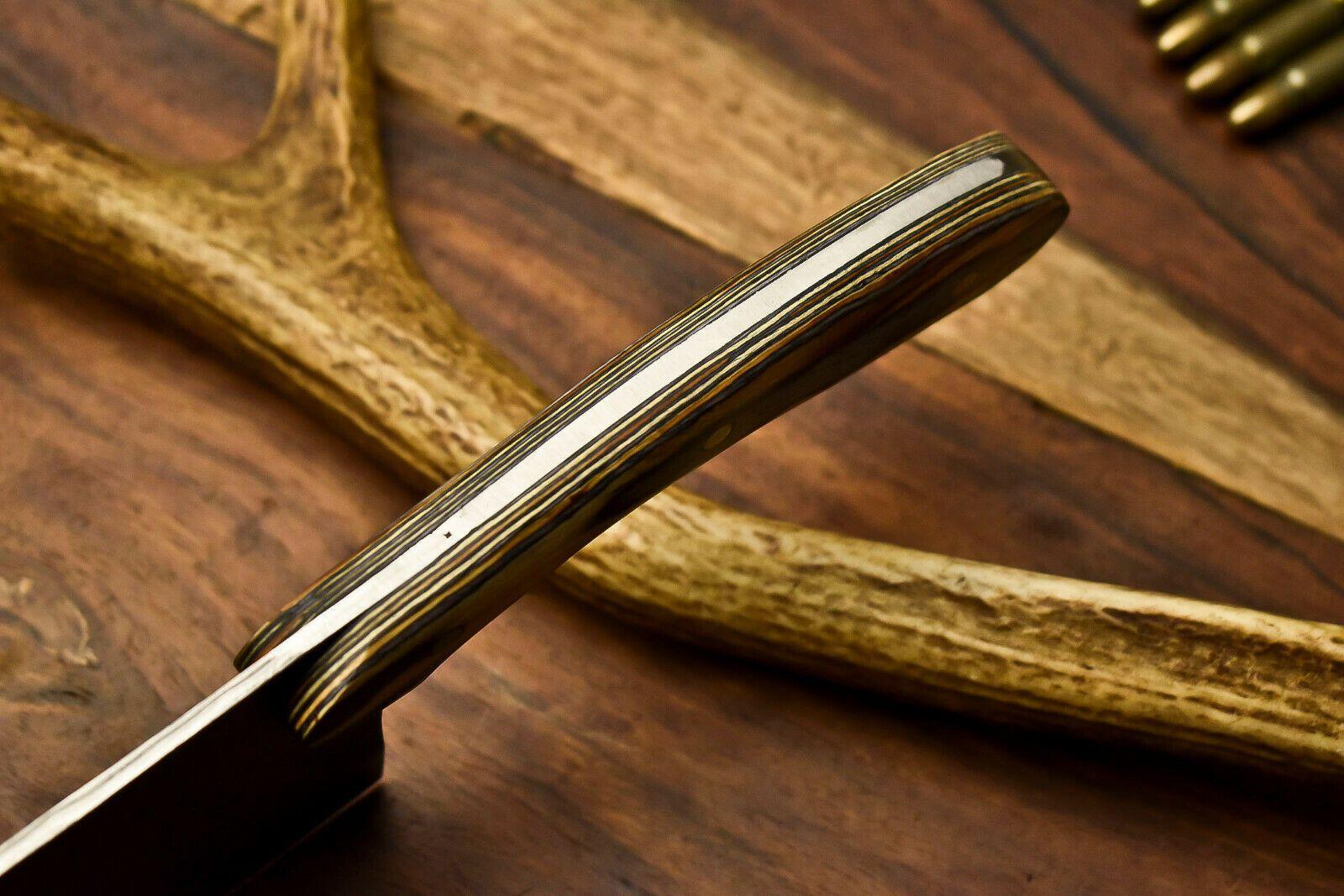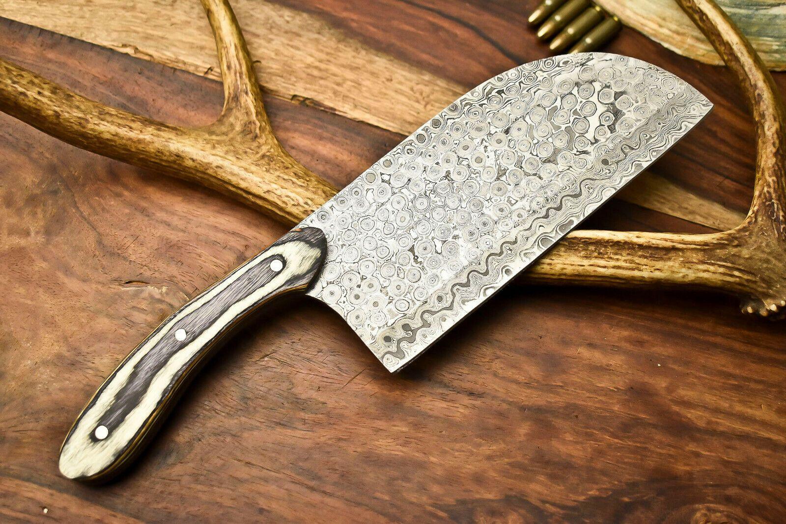 This handmade Damascus steel chef chopper knife is a perfect blend of beauty, durability, and functionality for your kitchen. With an overall length of 12 inches, a 7-inch razor-sharp blade, and a 5-inch comfortable hardwood handle, this full tang knife is designed for precision and balance. The blade is oil tempered to 58-60 HRC and edges are sharpened at 20 degrees, ensuring long-lasting sharpness and reliability. Crafted from a mixture of 1095 high carbon steel and 15N20 nickel carbon steel, the Damascus blade features 384 unique layers that showcase a striking black and satin wave pattern. Each knife undergoes acid etching to reveal its signature Damascus design, making it not only a reliable kitchen tool but also a work of art. The knife in the photos is exactly what you will receive — a strong, sharp, and beautifully crafted chopper knife that will elevate your cooking experience.