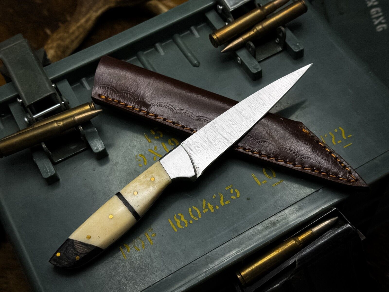 Handmade Damascus Steel Hunting Kitchen Chef Knife – Bone Handle with Leather Sheath