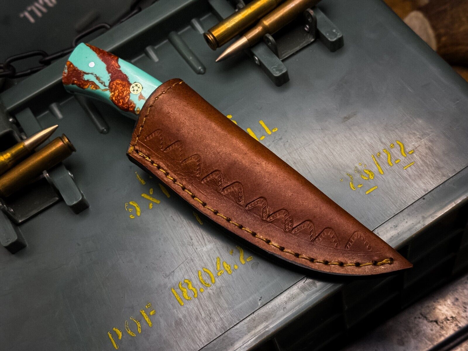 The handle is made from high-quality epoxy resin, offering a secure, ergonomic grip even in wet conditions. It also comes with a hand-stitched genuine cow leather sheath, ensuring safe storage and easy carry on the go.
