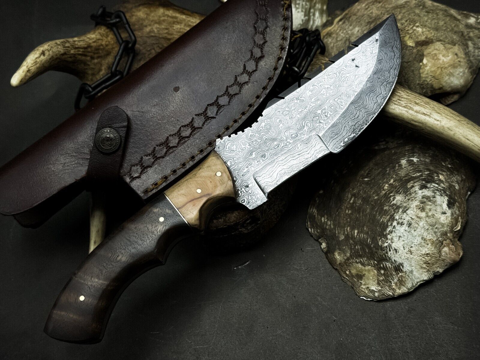 This Handmade Damascus Steel Hunting Survival Tracker Knife is a finely crafted blade designed for reliability, versatility, and long-lasting performance. this custom knife features a 3.5–4 inch drop point blade forged from premium Damascus steel, well known for its stunning layered patterns and razor-sharp edge retention. The plain edge design ensures clean, precise cuts, while the full tang construction provides maximum strength and balance, making it dependable in any situation. The handle is crafted from high-quality wood, offering both natural beauty and a secure grip that remains comfortable during extended use.Built for true multi-purpose functionality, this Damascus tracker knife is ideal for hunting, survival tasks, everyday carry, combat training, throwing practice, kitchen prep, and even boot carry. Its durable structure makes it a reliable tool for outdoor enthusiasts, chefs, collectors, and adventurers alike. The knife comes complete with a genuine leather sheath, providing safe storage and convenient portability wherever your journey takes you. Handmade with meticulous attention to detail, this unique knife combines functionality with artistry, making it not only a practical outdoor companion but also a collectible fixed blade masterpiece. For those who demand both style and performance, this knife is an excellent choice.