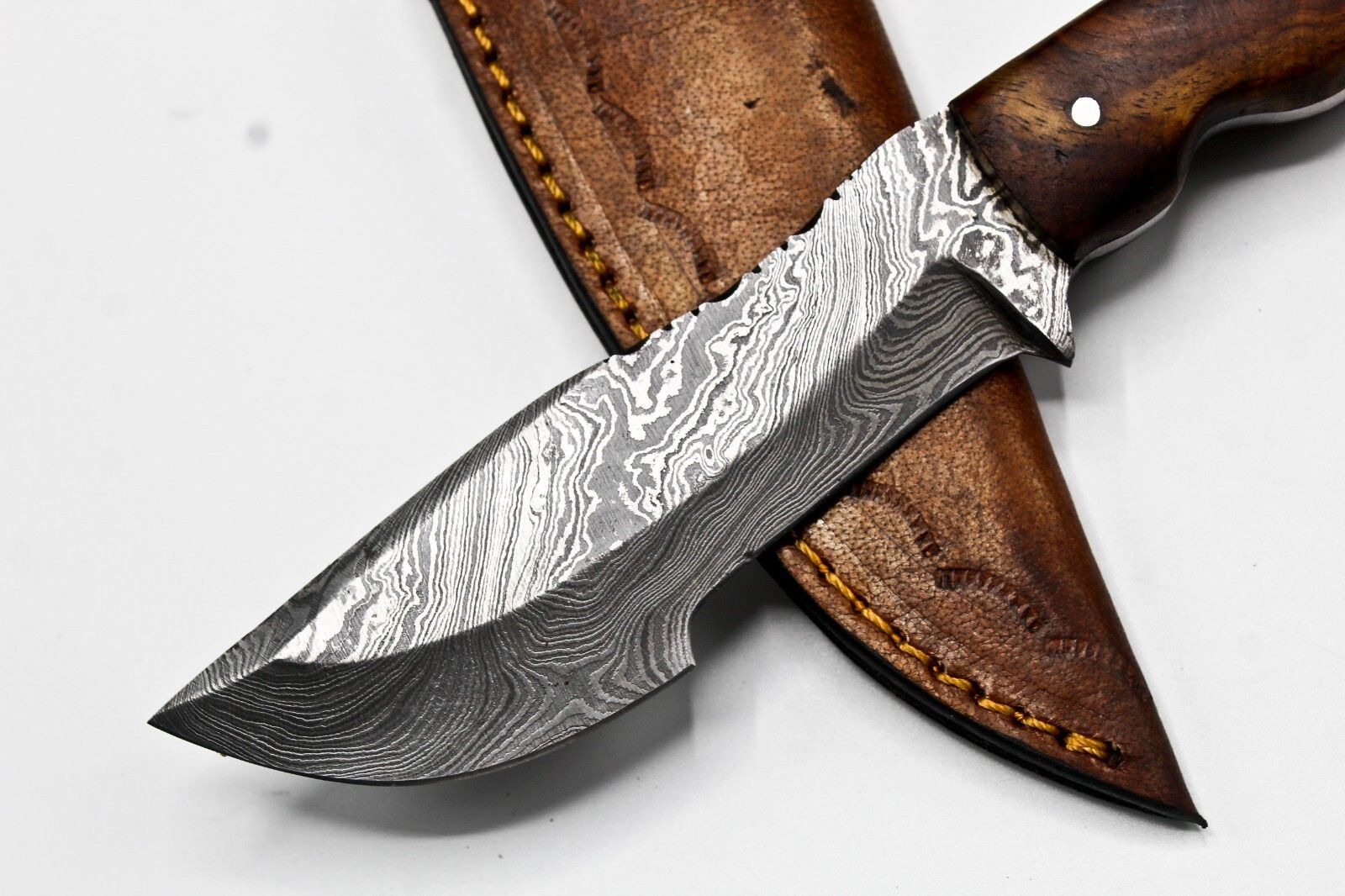 This handmade Damascus steel hunting tracker knife is the perfect blend of artistry and functionality, designed for hunters, campers, and survival enthusiasts. With a 5.0" blade, 5.0" handle, and an overall length of 10.0", this knife is crafted to deliver balance, durability, and cutting precision. The blade is oil-tempered to 58–60 HRC for long-lasting strength and excellent edge retention. Sharpened at a 20-degree angle, it provides superior sharpness for skinning, field dressing, bushcraft, and tactical use.The walnut wood handle offers a classic, comfortable grip while enhancing the knife’s aesthetic appeal. Forged from high carbon Damascus steel, the blade showcases unique acid-etched patterns, making each knife a true one-of-a-kind piece. While this steel holds an edge exceptionally well, proper care ensures its longevity. After use, always clean with soap and water, dry thoroughly, apply a thin coat of gun oil, and store separately from the sheath to prevent moisture damage.Every knife is 100% handmade by skilled artisans without CNC machining, giving each piece its own character and uniqueness. Whether used in the field or collected as a work of craftsmanship, this Damascus tracker knife is built to perform and made to last.