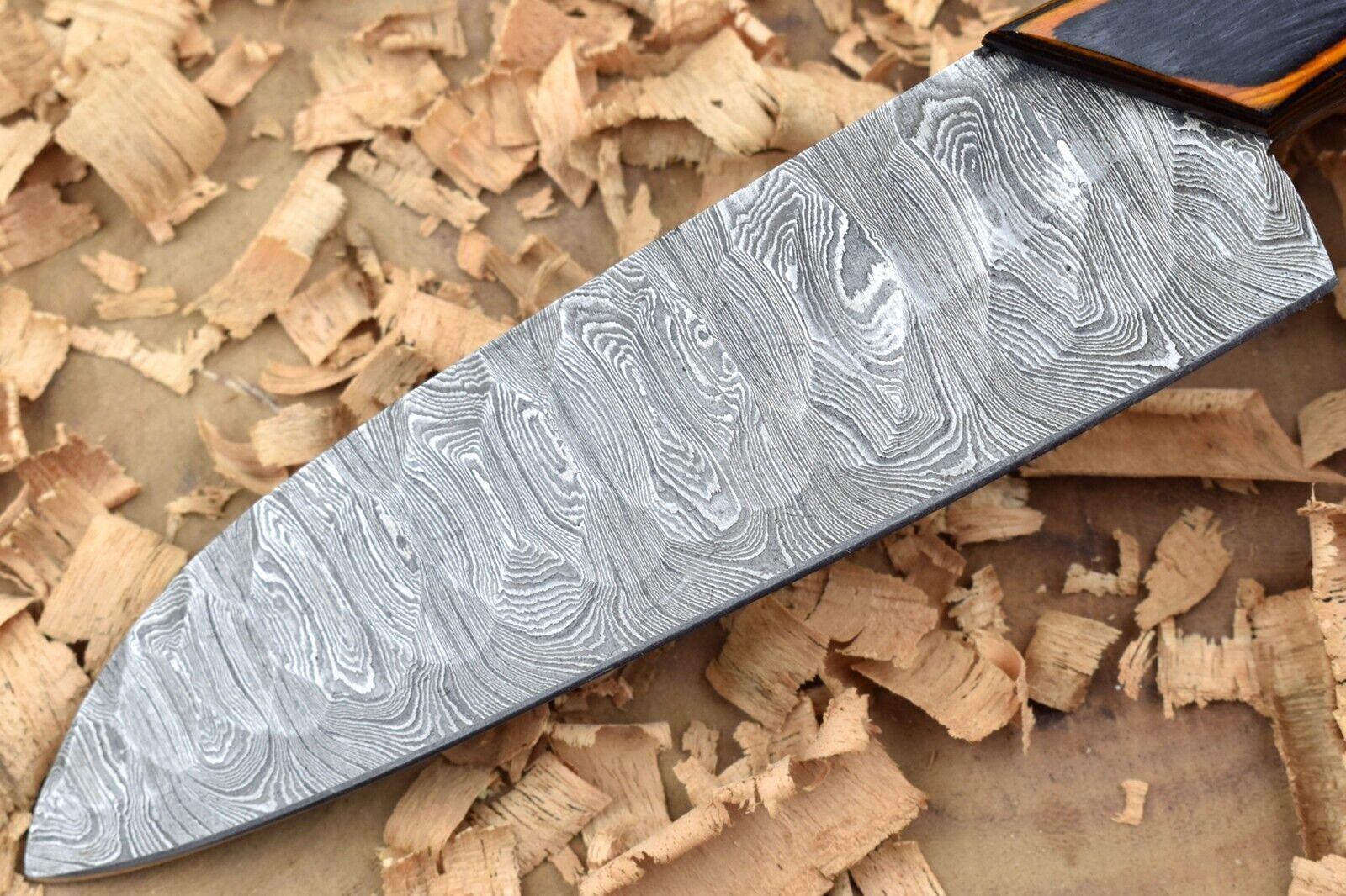 Add precision and style to your kitchen with this custom handmade Damascus steel chef knife. Forged with exceptional craftsmanship, this knife offers superior sharpness, durability, and balance. The striking black & orange Dollar Thappa handle with a Sturl open tang design ensures a secure, comfortable grip—perfect for both professional chefs and cooking enthusiasts.