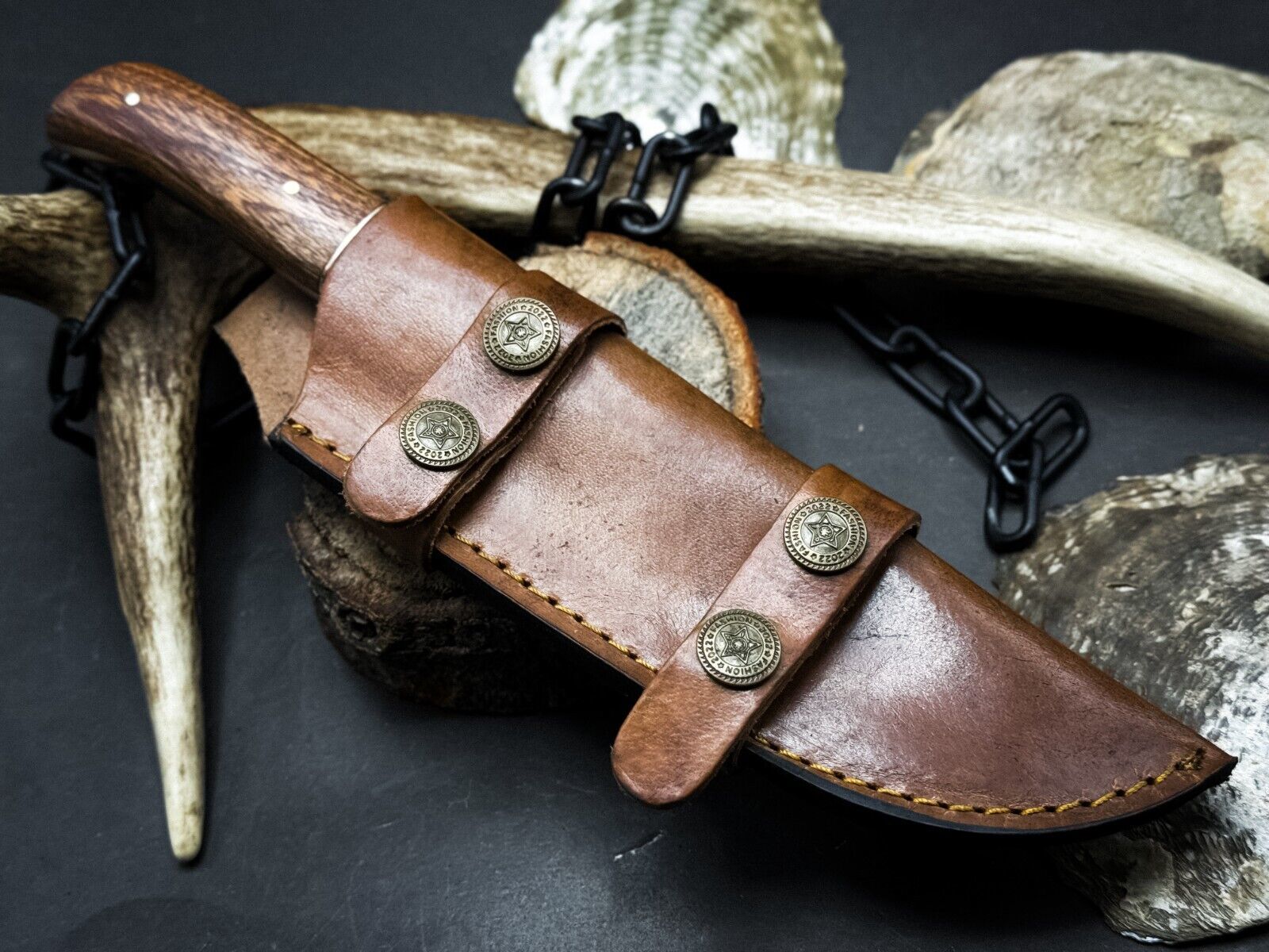 Designed for both left- and right-handed users, the wooden handle provides a comfortable, non-slip grip, making it perfect for extended use in any kitchen. Whether you're prepping daily meals, camping, or need a reliable utility tool, this knife is a versatile addition to any collection. It comes with a genuine leather sheath for safe storage and easy transport. Handmade in the USA with attention to detail, this original piece is ideal for chefs, collectors, and survivalists alike.