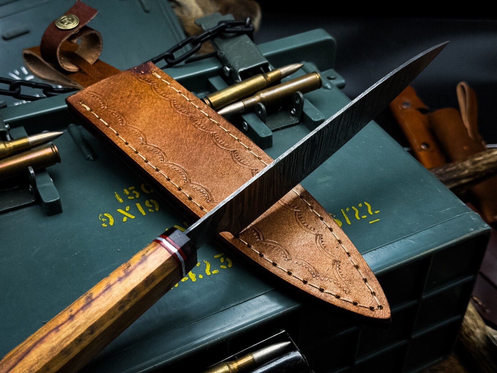 The blade, measuring over 5 inches, is forged from high-quality Damascus steel known for its strength, edge retention, and unique patterned finish. The smooth wooden handle offers a secure, ergonomic grip, ensuring comfort during long prep sessions. A genuine cow leather sheath is included for safe storage and portability.