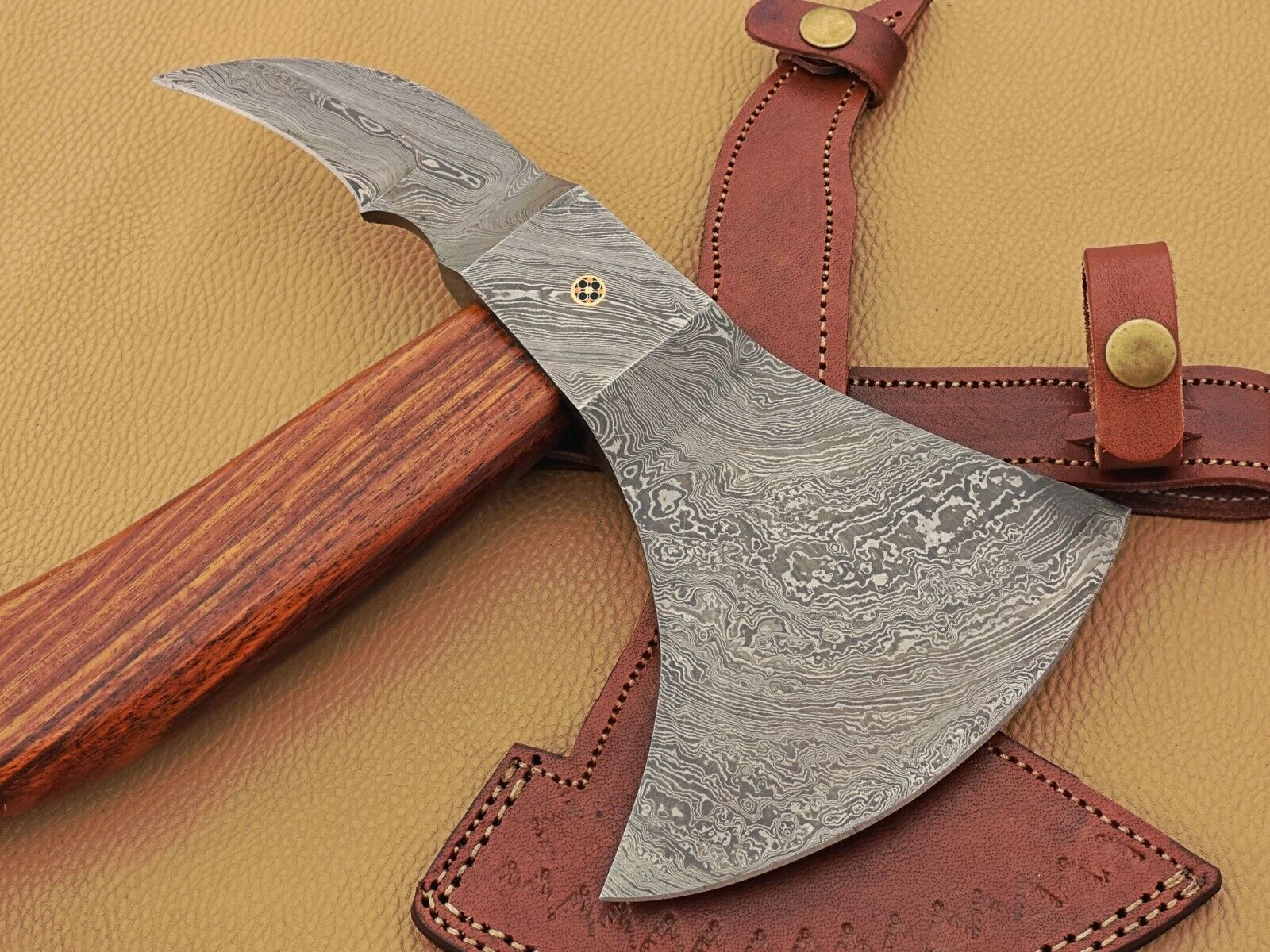 Handmade Damascus Steel Rosewood Viking Battle Axe Functional Full Tang Axe with Leather Sheath