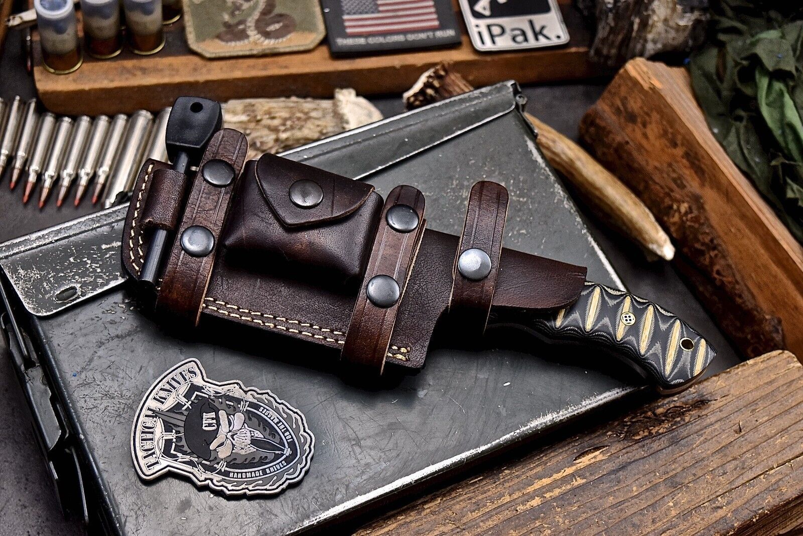 This Handmade Damascus Steel Tracker Chopper Knife with Micarta Handle is a premium-quality outdoor survival tool built for hunters, campers, and adventurers. With an overall length of 10 1/8 inches and a razor-sharp 4 7/8-inch hollow grind blade, this knife is designed for strength, durability, and precision cutting in demanding conditions. The blade is hand-forged from multiple layers of high-carbon Damascus steel, ensuring excellent edge retention, hardness, and the iconic wavy Damascus pattern that makes each knife unique. The ergonomic Micarta handle provides a secure, slip-resistant grip, offering superior comfort and control during extended use. This knife is perfect for chopping, skinning, bushcraft, or tactical survival scenarios, making it a versatile addition to any outdoor kit. Included with the knife is a complete set featuring a fire starter rod, a sharpening whetstone, and a handmade horizontal leather belt sheath crafted from premium cowhide for convenient carry and safe storage. Whether used as a reliable outdoor companion, a survival essential, or a collectible piece of fine craftsmanship, this handmade Damascus Tracker Chopper Knife is built to exceed expectations. A practical and stylish tool, it is an ideal choice for hunters, campers, collectors, and outdoor sports enthusiasts alike.