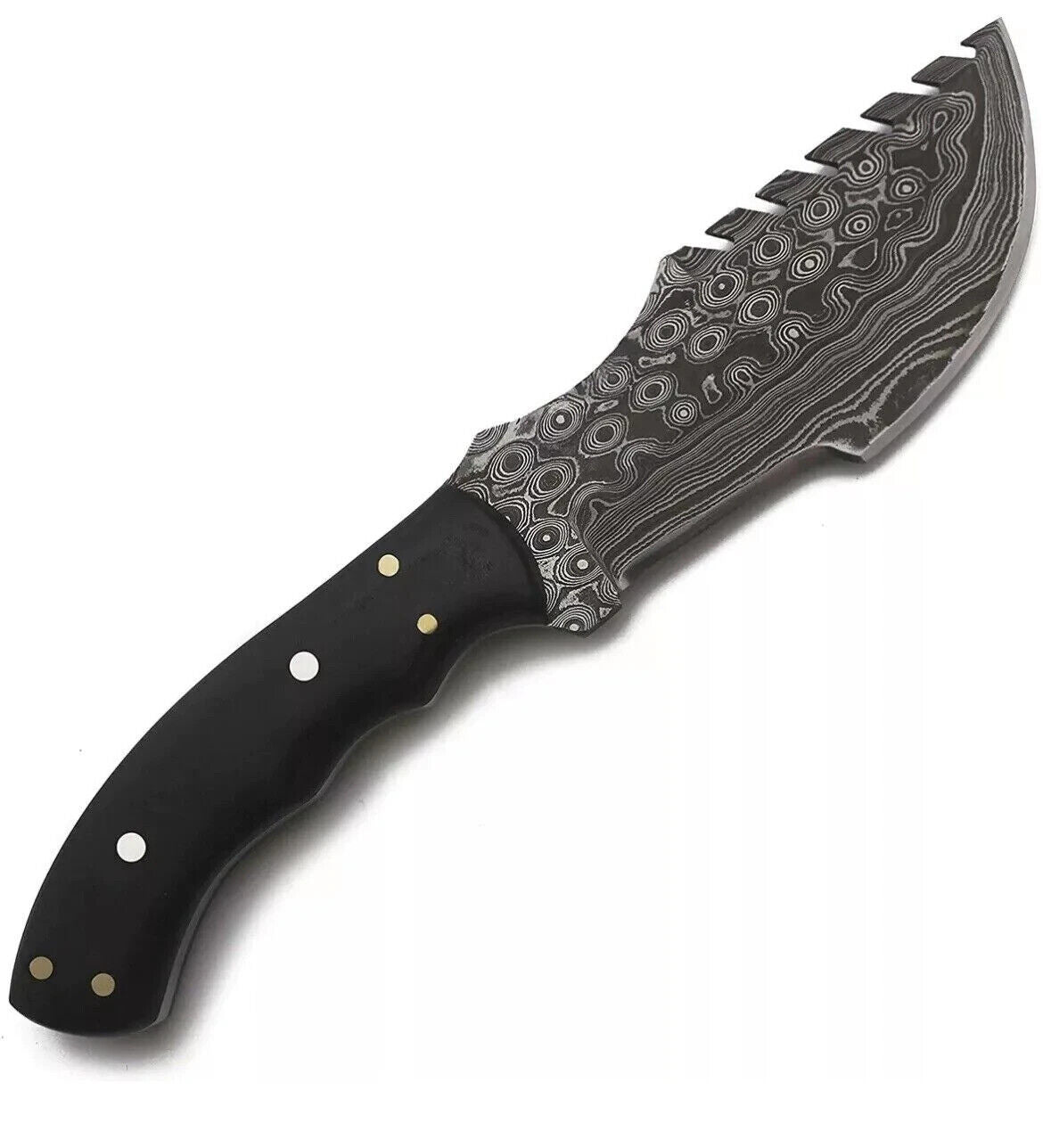 This Handmade Damascus Tracker Knife is a powerful and versatile tool, crafted for hunting, camping, hiking, survival, and everyday carry (EDC). Each knife is hand forged from 512 layers of 4340 stainless steel and 1075 high carbon steel, producing a stunning ladder pattern Damascus blade that is as functional as it is beautiful. Oil tempered to 55–58 HRC, the blade offers excellent toughness, razor sharpness, and edge retention, making it ideal for demanding outdoor use.With an overall length of 10 inches, this knife features a 5-inch blade and a 5-inch polished wooden handle, designed to provide a secure and comfortable grip even during extended use. Its full tang construction ensures maximum strength and balance, while the fine file work along the blade highlights the craftsmanship that goes into every piece.Perfect for bushcraft, survival tasks, skinning, chopping, or general camp use, this Damascus steel knife is built to handle tough outdoor environments. Each knife comes with a hand-stitched leather sheath, allowing safe storage and easy belt carry. A reliable tool for adventurers, collectors, and outdoorsmen, it also makes a unique and practical gift for any occasion.
