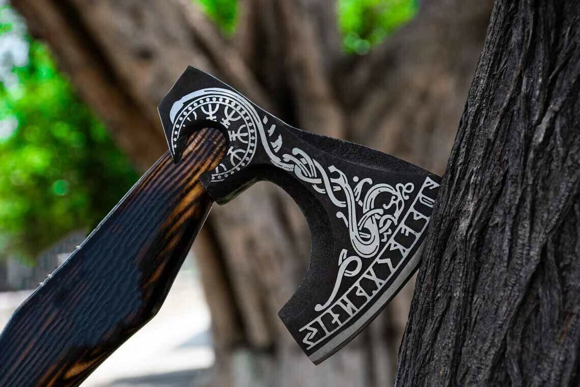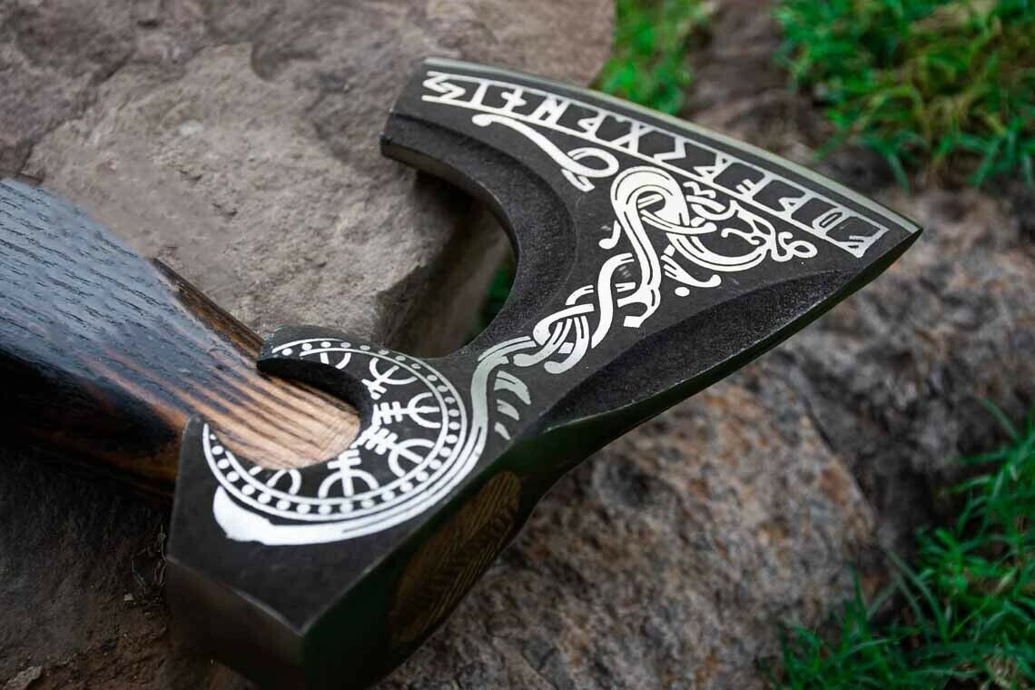 This Viking hunting axe is a meticulously handmade forged carbon steel weapon, perfect for collectors, reenactors, and enthusiasts of authentic Norse craftsmanship. Measuring 18.5 inches in overall length with a 6-inch head width and 6-inch cutting blade, it delivers sharpness, durability, and precise performance. The axe head is hand-engraved and fully forged, showcasing intricate designs that reflect traditional Viking artistry. Constructed from high-quality carbon steel with a hardness of 55-58 HRC, the blade is both strong and resilient. Each axe comes with a leather sheath for safe storage and convenient transport. Ideal as a replica Viking axe, it is suitable for outdoor use, historical reenactments, or display in a collection. Proper care, including keeping the blade dry after cleaning, ensures long-lasting sharpness and maintains the beauty of the hand-forged steel. This fully handcrafted axe combines artistic craftsmanship with functional design, making it a standout piece for enthusiasts of Viking battle axes and collectors alike.