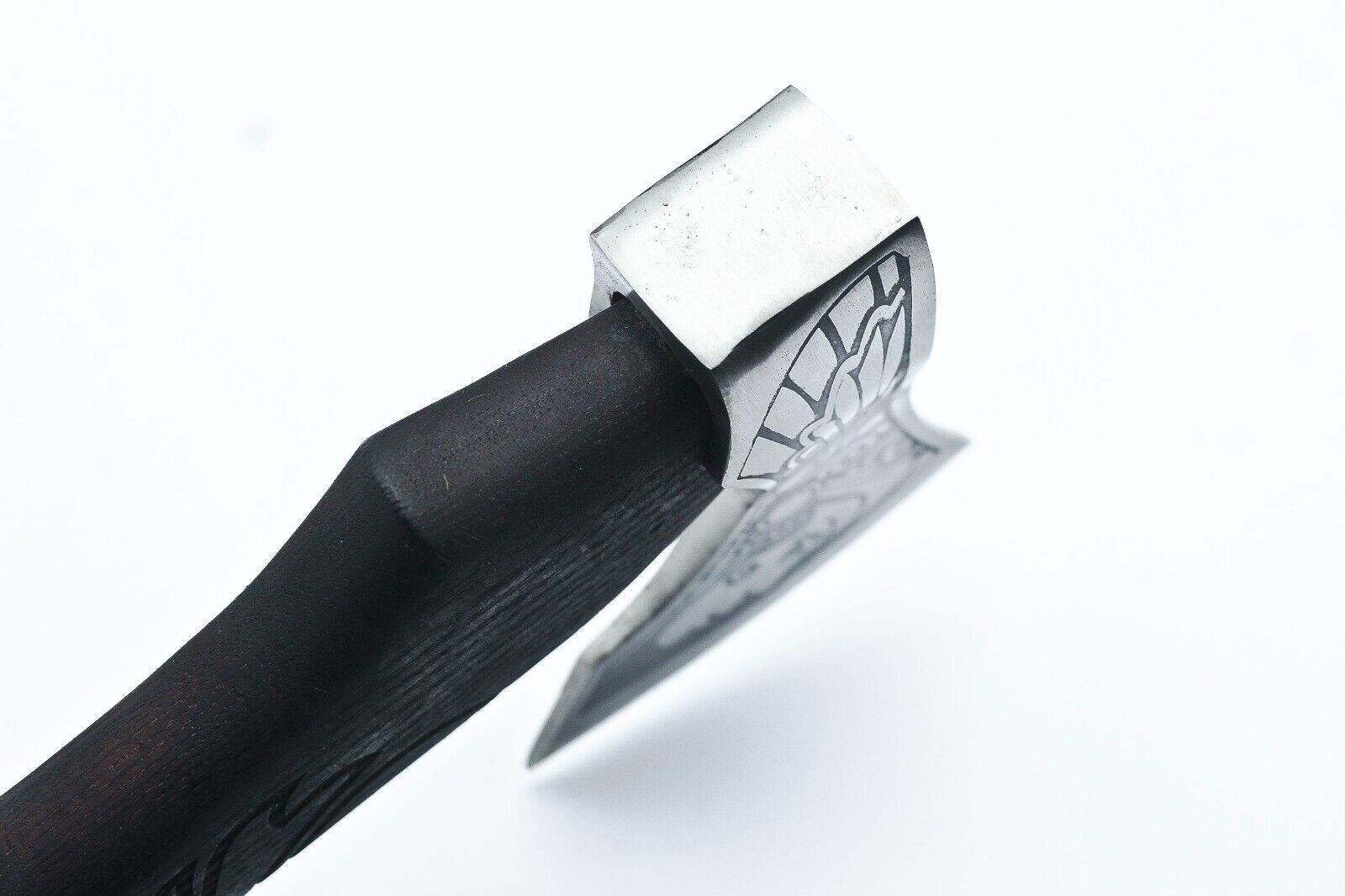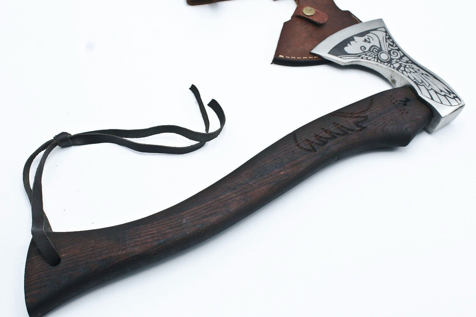 Elevate your collection with this Handmade Etched High Carbon Steel Viking Axe, a perfect blend of craftsmanship and functionality. This axe features a 19-inch overall length and a 6.5-inch cutting edge, forged from durable high carbon steel for long-lasting sharpness and strength. The blade is intricately etched, showcasing unique designs that add a decorative yet rugged aesthetic to the axe. The handle is crafted from solid Ashwood and wrapped in leather, providing a secure and comfortable grip for practical use. Each axe comes with a hand-sewn leather sheath, ensuring safe storage and convenient transport. Fully handmade, every piece is unique and may have subtle variations, making it a true collector’s item. Ideal for camping, outdoor activities, or as a striking display piece, this Viking Axe combines historical inspiration with modern durability. Buyers must exercise caution due to its sharp edge, and it is intended for legal use by responsible adults.