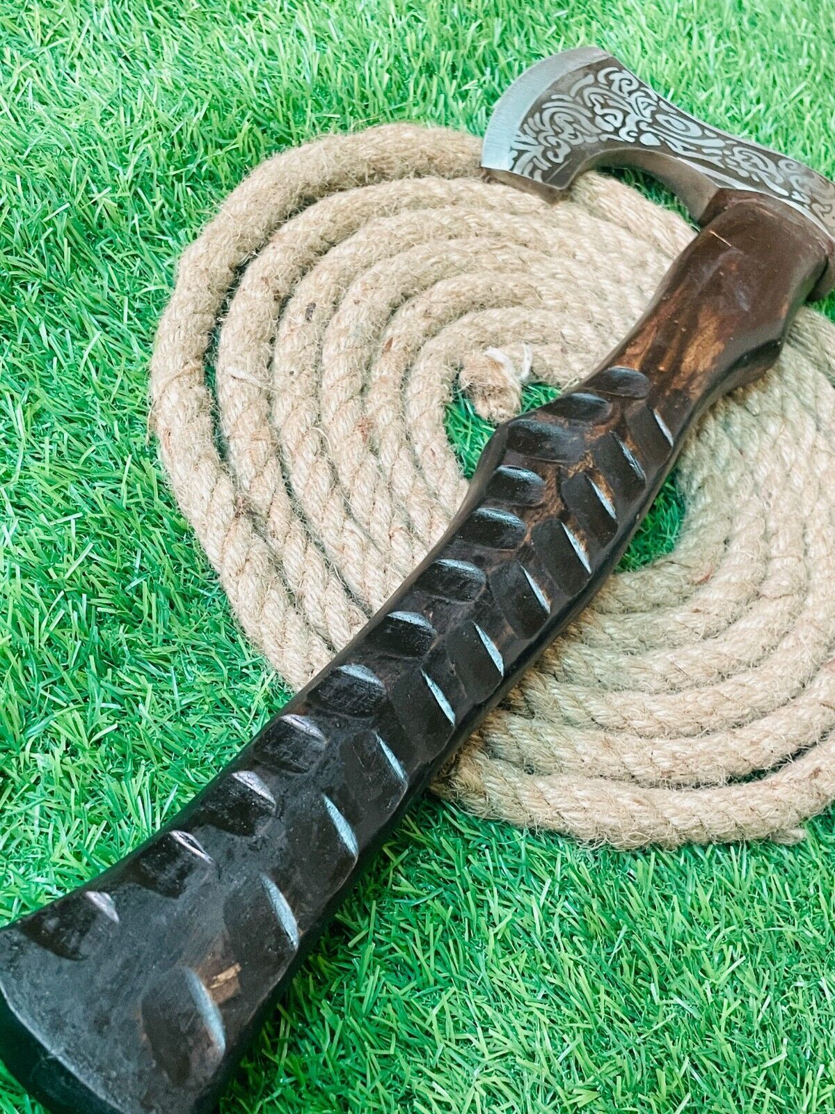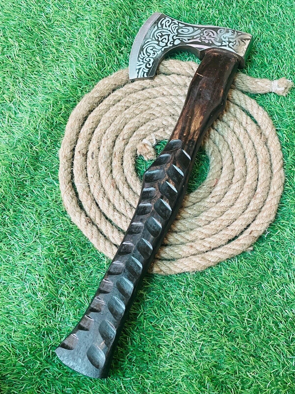 Crafted with precision and care, this steel Viking bearded camping hatchet tomahawk axe is a testament to authentic craftsmanship. Combining the strength and durability of high carbon steel with a design inspired by the rugged Viking era, this axe is ideal for both functional use and collection. Its balanced weight ensures efficient control while chopping through wood, underbrush, or for outdoor camping tasks.